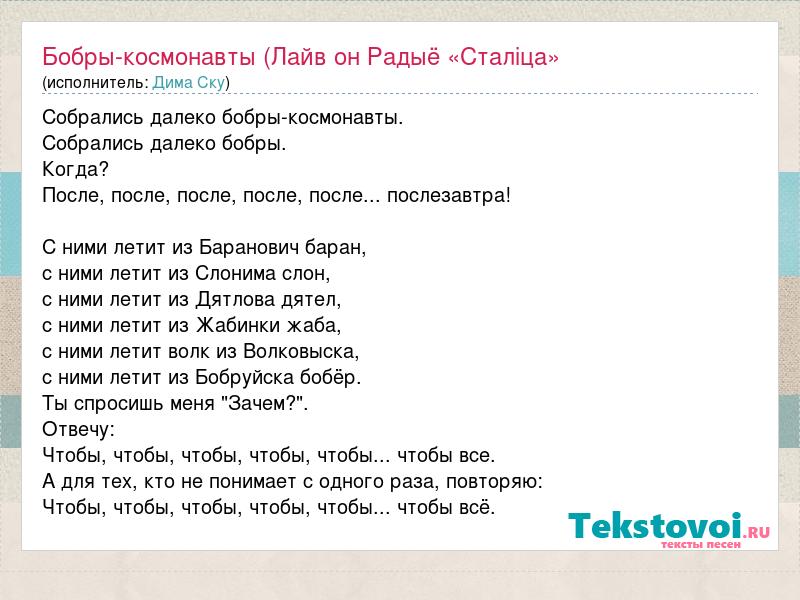 Собрались далеко бобры-космонавты. Собрались далеко бобры. Когда? После, после, после, после, после... послезавтра! С ними летит из Баранович баран, с ними летит из Слонима слон, с ними летит из Дятлова дятел, с ними летит из Жабинки жаба, с ними летит волк из Волковыска, с ними летит из Бобруйска бобёр. Ты спросишь меня "Зачем?". Отвечу: Чтобы, чтобы, чтобы, чтобы, чтобы... чтобы все. А для тех, кто не понимает с одного раза, повторяю: Чтобы, чтобы, чтобы, чтобы, чтобы... чтобы всё.
