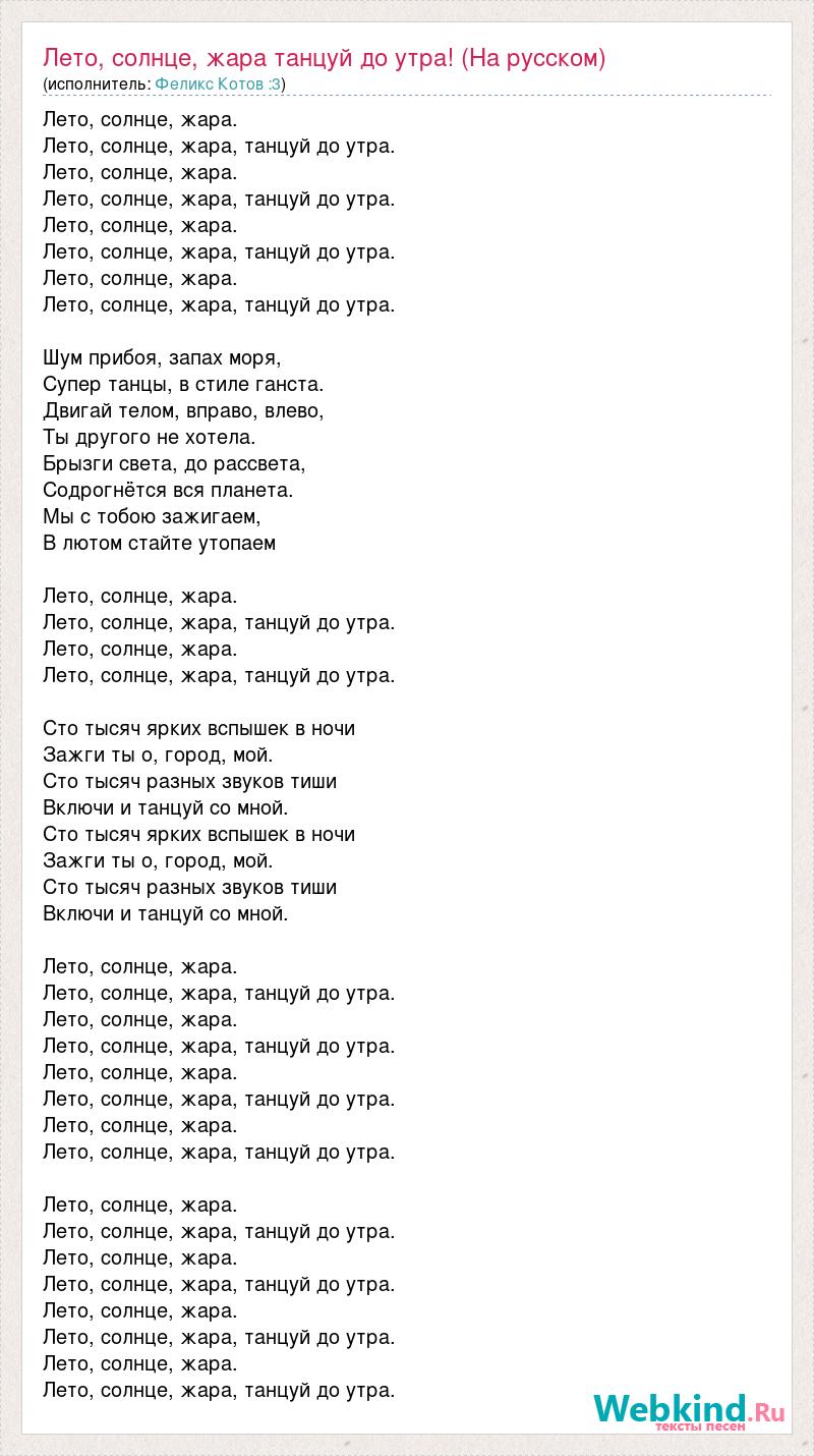 Лето, солнце, жара. Лето, солнце, жара, танцуй до утра. Лето, солнце, жара. Лето, солнце, жара, танцуй до утра. Лето, солнце, жара. Лето, солнце, жара, танцуй до утра. Лето, солнце, жара. Лето, солнце, жара, танцуй до утра. Шум прибоя, запах моря, Супер танцы, в стиле ганста. Двигай телом, вправо, влево, Ты другого не хотела. Брызги света, до рассвета, Содрогнётся вся планета. Мы с тобою зажигаем, В лютом стайте утопаем Лето, солнце, жара. Лето, солнце, жара, танцуй до утра. Лето, солнце, жара. Лето, солнце, жара, танцуй до утра. Сто тысяч ярких вспышек в ночи Зажги ты о, город, мой. Сто тысяч разных звуков тиши Включи и танцуй со мной. Сто тысяч ярких вспышек в ночи Зажги ты о, город, мой. Сто тысяч разных звуков тиши Включи и танцуй со мной. Лето, солнце, жара. Лето, солнце, жара, танцуй до утра. Лето, солнце, жара. Лето, солнце, жара, танцуй до утра. Лето, солнце, жара. Лето, солнце, жара, танцуй до утра. Лето, солнце, жара. Лето, солнце, жара, танцуй до утра. Лето, солнце, жара. Лето, солнце, жара, танцуй до утра. Лето, солнце, жара. Лето, солнце, жара, танцуй до утра. Лето, солнце, жара. Лето, солнце, жара, танцуй до утра. Лето, солнце, жара. Лето, солнце, жара, танцуй до утра.