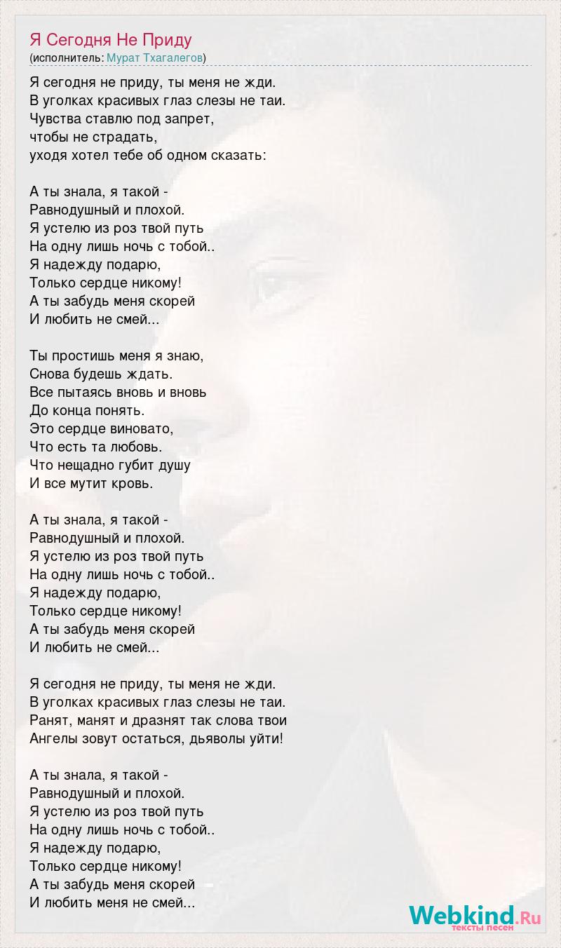 Я сегодня не приду, ты меня не жди. В уголках красивых глаз слезы не таи. Чувства ставлю под запрет, чтобы не страдать, уходя хотел тебе об одном сказать: А ты знала, я такой - Равнодушный и плохой. Я устелю из роз твой путь На одну лишь ночь с тобой.. Я надежду подарю, Только сердце никому! А ты забудь меня скорей И любить не смей... Ты простишь меня я знаю, Снова будешь ждать. Все пытаясь вновь и вновь До конца понять. Это сердце виновато, Что есть та любовь. Что нещадно губит душу И все мутит кровь. А ты знала, я такой - Равнодушный и плохой. Я устелю из роз твой путь На одну лишь ночь с тобой.. Я надежду подарю, Только сердце никому! А ты забудь меня скорей И любить не смей... Я сегодня не приду, ты меня не жди. В уголках красивых глаз слезы не таи. Ранят, манят и дразнят так слова твои Ангелы зовут остаться, дьяволы уйти! А ты знала, я такой - Равнодушный и плохой. Я устелю из роз твой путь На одну лишь ночь с тобой.. Я надежду подарю, Только сердце никому! А ты забудь меня скорей И любить меня не смей...