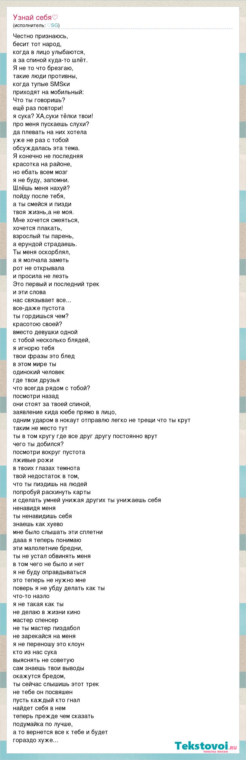Честно признаюсь, бесит тот народ, когда в лицо улыбаются, а за спиной куда-то шлёт. Я не то что брезгаю, такие люди противны, когда тупые SMSки приходят на мобильный: Что ты говоришь? ещё раз повтори! я сука? ХА,суки тёлки твои! про меня пускаешь слухи? да плевать на них хотела уже не раз с тобой обсуждалась эта тема. Я конечно не последняя красотка на районе, но ебать всем мозг я не буду, запомни. Шлёшь меня нахуй? пойду после тебя, а ты смейся и пизди твоя жизнь,а не моя. Мне хочется смеяться, хочется плакать, взрослый ты парень, а ерундой страдаешь. Ты меня оскорблял, а я молчала заметь рот не открывала и просила не лезть Это первый и последний трек и эти слова нас связывает все... все-даже пустота ты гордишься чем? красотою своей? вместо девушки одной с тобой несколько блядей, я игнорю тебя твои фразы это блед в этом мире ты одинокий человек где твои друзья что всегда рядом с тобой? посмотри назад они стоят за твоей спиной, заявление кида юебе прямо в лицо, одним ударом в нокаут отправлю легко не трещи что ты крут таким не место тут ты в том кругу где все друг другу постоянно врут чего ты добился? посмотри вокруг пустота лживые рожи в твоих глазах темнота твой недостаток в том, что ты пиздишь на людей попробуй раскинуть карты и сделать умней унижая других ты унижаешь себя ненавидя меня ты ненавидишь себя знаешь как хуево мне было слышать эти сплетни дааа я теперь понимаю эти малолетние бредни, ты не устал обвинять меня в том чего не было и нет я не буду оправдываться это теперь не нужно мне поверь я не убду делать как ты что-то назло я не такая как ты не делаю в жизни кино мастер спенсер не ты мастер пиздабол не зарекайся на меня я не переношу это клоун кто из нас сука выяснять не советую сам знаешь твои выводы окажутся бредом, ты сейчас слышишь этот трек не тебе он посвяшен пусть каждый кто гнал найдет себя в нем теперь прежде чем сказать подумайка по лучше, а то вернется все к тебе и будет гораздо хуже...