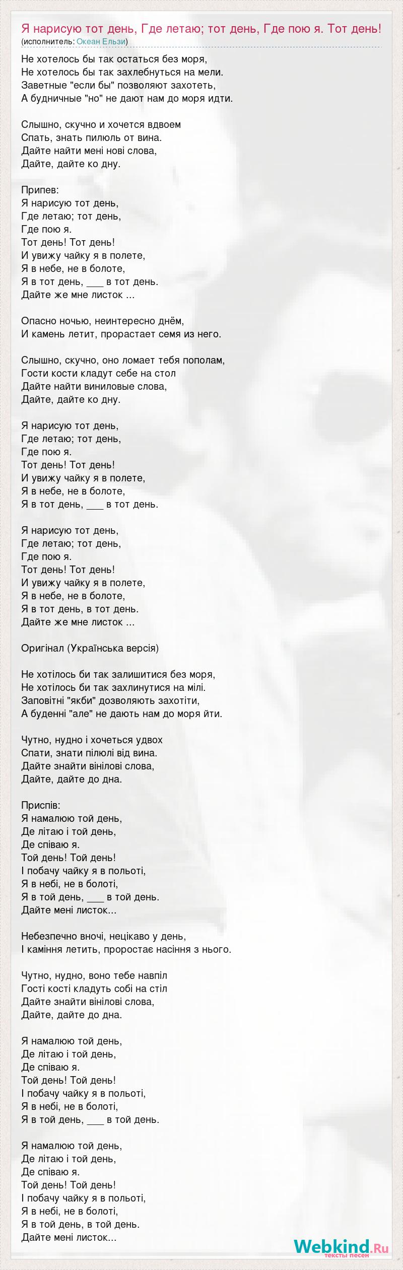 Не хотелось бы так остаться без моря, Не хотелось бы так захлебнуться на мели. Заветные "если бы" позволяют захотеть, А будничные "но" не дают нам до моря идти. Слышно, скучно и хочется вдвоем Спать, знать пилюль от вина. Дайте найти менi новi слова, Дайте, дайте ко дну. Припев: Я нарисую тот день, Где летаю; тот день, Где пою я. Тот день! Тот день! И увижу чайку я в полете, Я в небе, не в болоте, Я в тот день, ___ в тот день. Дайте же мне листок ... Опасно ночью, неинтересно днём, И камень летит, прорастает семя из него. Слышно, скучно, оно ломает тебя пополам, Гости кости кладут себе на стол Дайте найти виниловые слова, Дайте, дайте ко дну. Я нарисую тот день, Где летаю; тот день, Где пою я. Тот день! Тот день! И увижу чайку я в полете, Я в небе, не в болоте, Я в тот день, ___ в тот день. Я нарисую тот день, Где летаю; тот день, Где пою я. Тот день! Тот день! И увижу чайку я в полете, Я в небе, не в болоте, Я в тот день, в тот день. Дайте же мне листок ... Оригінал (Українська версія) Не хотілось би так залишитися без моря, Не хотілось би так захлинутися на мілі. Заповітні "якби" дозволяють захотіти, А буденні "але" не дають нам до моря йти. Чутно, нудно і хочеться удвох Спати, знати пілюлі від вина. Дайте знайти вінілові слова, Дайте, дайте до дна. Приспів: Я намалюю той день, Де літаю і той день, Де співаю я. Той день! Той день! І побачу чайку я в польоті, Я в небі, не в болоті, Я в той день, ___ в той день. Дайте мені листок... Небезпечно вночі, нецікаво у день, І каміння летить, проростає насіння з нього. Чутно, нудно, воно тебе навпіл Гості кості кладуть собі на стіл Дайте знайти вінілові слова, Дайте, дайте до дна. Я намалюю той день, Де літаю і той день, Де співаю я. Той день! Той день! І побачу чайку я в польоті, Я в небі, не в болоті, Я в той день, ___ в той день. Я намалюю той день, Де літаю і той день, Де співаю я. Той день! Той день! І побачу чайку я в польоті, Я в небі, не в болоті, Я в той день, в той день. Дайте мені листок...