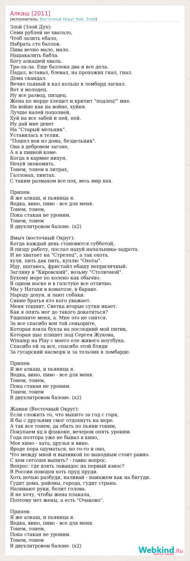 Злой (Злой Дух): Семи рублей не хватало, Чтоб залить ебало, Набрать сто баллов. Пива вечно мало, мало. Нашакалить бабла. Богу алкашей хвала. Тра-ла-ла. Еще баллона два и все дела. Падал, вставал, блевал, на прохожих гнал, гнал. Дома скандал. Вечно пьяный в кал кольцо в ломбард загнал. Вот я молодец. Ну все развод, пиздец. Жена по морде хлещет и кричит "подлец!" мне. На войне как на войне, хуйня. Лучше налей пополней, Хуй на все забей и пей, пей. Ну дай мне денег На "Старый мельник". Уставилась в телик. "Пошел вон из дома, бездельник". Она в дебровом загоне, А я в пивной коме. Когда в кармне нихуя, Нехуй экономить. Тонем, тонем в литрах, Галлонах, пинтах. С таким размахом все пох, весь мир нах. Припев: Я же алкаш, и пьяница я. Водка, вино, пиво - все для меня. Тонем, тонем, Пока стакан не уроним. Тонем, тонем В двухлитровом балоне. (x2) Ямыч (восточный Округ): Когда каждый день становится субботой, В пизду работу, послал нахуй начальника-задрота. И не хватает на "Стрелец", а так охота. хули, пить дак пить, куплю "Охоты". Иду, шатаюсь, фристайл ебашу неприличный. Загляну в "Кировский", возьму "Столичной". Бухому море по колено как обычно. В одном носке и в галстуке все отлично. Мы у Натахи в коматозе, в бараке. Народу дохуя, и лают собаки. Синие братья кто кого уважает. Меня тошнит, Светка вторые сутки икает. Как я опять мог до такого докатиться? Ущипните меня, а. Мне это не снится. За все спасибо вон той сеньорите, Которая взяла бухла на последний мой питик, Которая щас пляшет под Сергея Жукова, Winamp на Play с моего еле живого ноутбука. Спасибо ей за все, спасибо этой бляди За гусарский насморк и за тельчик в ломбарде. Припев: Я же алкаш, и пьяница я. Водка, вино, пиво - все для меня. Тонем, тонем, Пока стакан не уроним. Тонем, тонем В двухлитровом балоне. (x2) Жаман (Восточный Округ): Если сложить то, что выпито за год с горя, Я бы с друзьями смог отдохнуть на море. А так все тонем, да ебать по пьяни гоним, Покупаем яд в флаконе, вечером опять уроним. Года полтора уже не бывал в кино, Мое кино - хата, друзья и вино. Вроде пора одуматься, но то-то и оно, Что между мной и выпивкой по выходным стоит равно. С кем сеголня выпить? - гавно вопрос. Вопрос: где взять лавандос на первый взнос? В России поводов хоть пруд пруди. Хоть ночью разбуди, наливай - намажем как на бигуди. Гудят дома, районы, города, гудит страна. Наливают руки, болит голова. Я не хочу, чтобы жена плакала, Поэтому нет жены, а есть "Очаково". Припев: Я же алкаш, и пьяница я. Водка, вино, пиво - все для меня. Тонем, тонем, Пока стакан не уроним. Тонем, тонем В двухлитровом балоне. (x2)