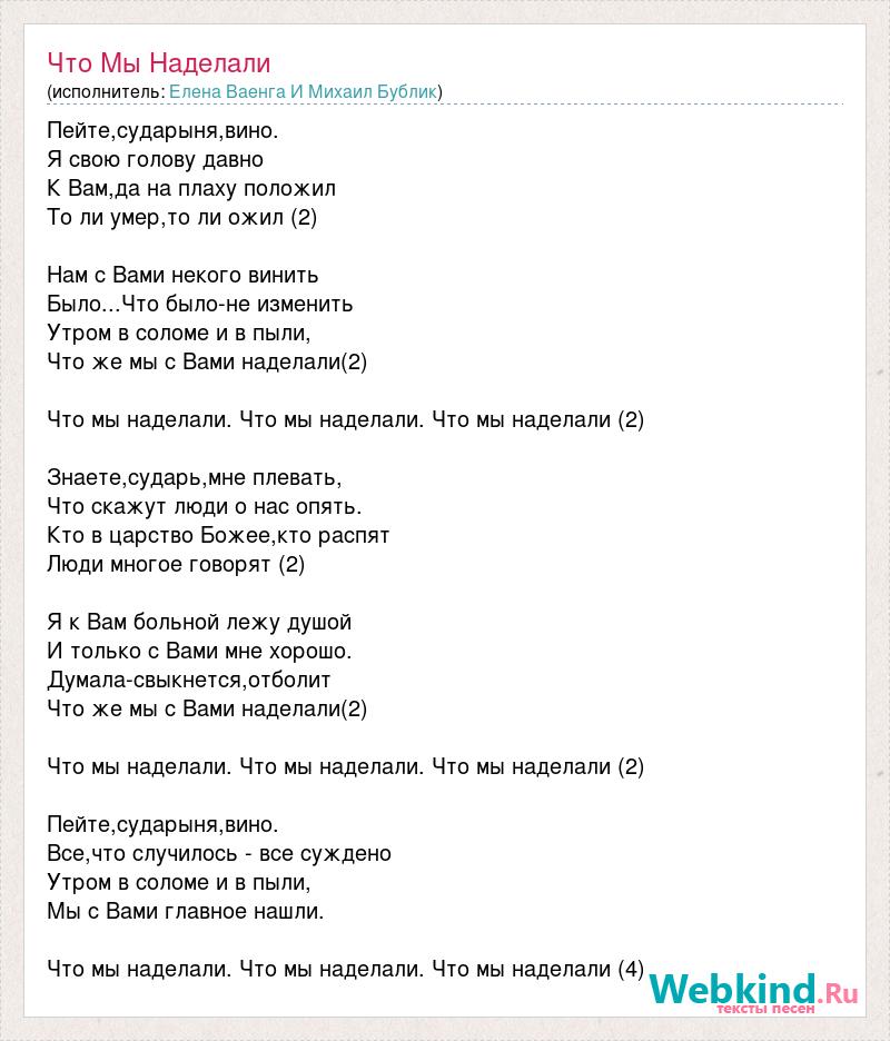 Пейте,сударыня,вино. Я свою голову давно К Вам,да на плаху положил То ли умер,то ли ожил (2) Нам с Вами некого винить Было...Что было-не изменить Утром в соломе и в пыли, Что же мы с Вами наделали(2) Что мы наделали. Что мы наделали. Что мы наделали (2) Знаете,сударь,мне плевать, Что скажут люди о нас опять. Кто в царство Божее,кто распят Люди многое говорят (2) Я к Вам больной лежу душой И только с Вами мне хорошо. Думала-свыкнется,отболит Что же мы с Вами наделали(2) Что мы наделали. Что мы наделали. Что мы наделали (2) Пейте,сударыня,вино. Все,что случилось - все суждено Утром в соломе и в пыли, Мы с Вами главное нашли. Что мы наделали. Что мы наделали. Что мы наделали (4)