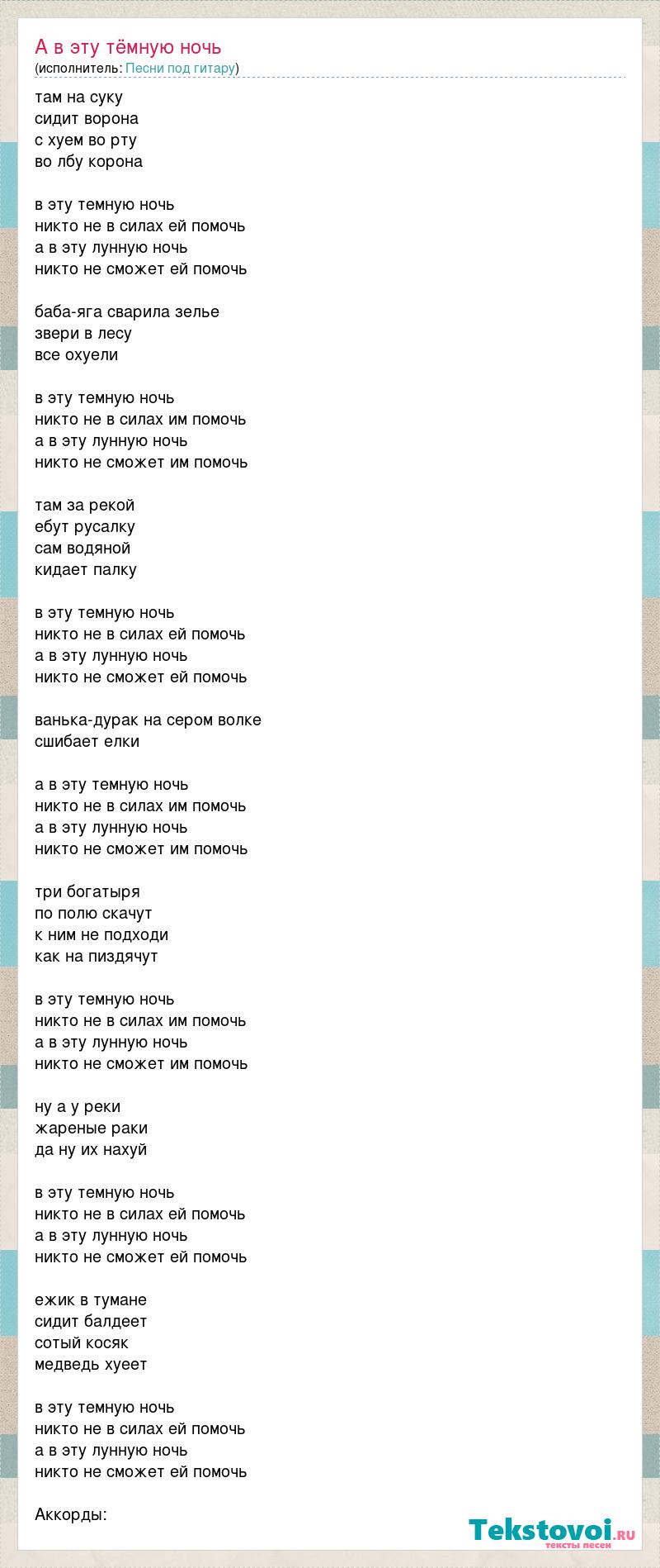 там на суку сидит ворона с хуем во рту во лбу корона в эту темную ночь никто не в силах ей помочь а в эту лунную ночь никто не сможет ей помочь баба-яга сварила зелье звери в лесу все охуели в эту темную ночь никто не в силах им помочь а в эту лунную ночь никто не сможет им помочь там за рекой ебут русалку сам водяной кидает палку в эту темную ночь никто не в силах ей помочь а в эту лунную ночь никто не сможет ей помочь ванька-дурак на сером волке сшибает елки а в эту темную ночь никто не в силах им помочь а в эту лунную ночь никто не сможет им помочь три богатыря по полю скачут к ним не подходи как на пиздячут в эту темную ночь никто не в силах им помочь а в эту лунную ночь никто не сможет им помочь ну а у реки жареные раки да ну их нахуй в эту темную ночь никто не в силах ей помочь а в эту лунную ночь никто не сможет ей помочь ежик в тумане сидит балдеет сотый косяк медведь хуеет в эту темную ночь никто не в силах ей помочь а в эту лунную ночь никто не сможет ей помочь Аккорды:
