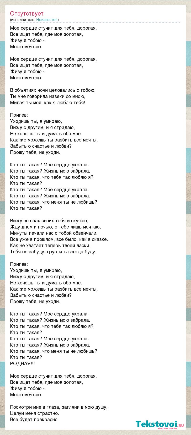 Мое сердце стучит для тебя, дорогая, Все ищет тебя, где моя золотая, Живу я тобою - Моею мечтою. Мое сердце стучит для тебя, дорогая, Все ищет тебя, где моя золотая, Живу я тобою - Моею мечтою. В объятиях ночи целовались с тобою, Ты мне говорила навеки со мною, Милая ты моя, как я люблю тебя! Припев: Уходишь ты, я умираю, Вижу с другим, и я страдаю, Не хочешь ты и думать обо мне. Как же можешь ты разбить все мечты, Забыть о счастье и любви? Прошу тебя, не уходи. Кто ты такая? Мое сердце украла. Кто ты такая? Жизнь мою забрала. Кто ты такая, что тебя так люблю я? Кто ты такая? Кто ты такая? Мое сердце украла. Кто ты такая? Жизнь мою забрала. Кто ты такая, что меня ты не любишь? Кто ты такая? Вижу во снах своих тебя и скучаю, Жду днем и ночью, о тебе лишь мечтаю, Минуты печали нас с тобой обвенчали. Все уже в прошлом, все было, как в сказке. Как не хватает теперь твоей ласки. Тебя не забуду, грустить всегда буду. Припев: Уходишь ты, я умираю, Вижу с другим, и я страдаю, Не хочешь ты и думать обо мне. Как же можешь ты разбить все мечты, Забыть о счастье и любви? Прошу тебя, не уходи. Кто ты такая? Мое сердце украла. Кто ты такая? Жизнь мою забрала. Кто ты такая, что тебя так люблю я? Кто ты такая? Кто ты такая? Мое сердце украла. Кто ты такая? Жизнь мою забрала. Кто ты такая, что меня ты не любишь? Кто ты такая? РОДНАЯ!!! Мое сердце стучит для тебя, дорогая, Все ищет тебя, где моя золотая, Живу я тобою - Моею мечтою. Посмотри мне в глаза, загляни в мою душу, Целуй меня страстно. Все будет прекрасно