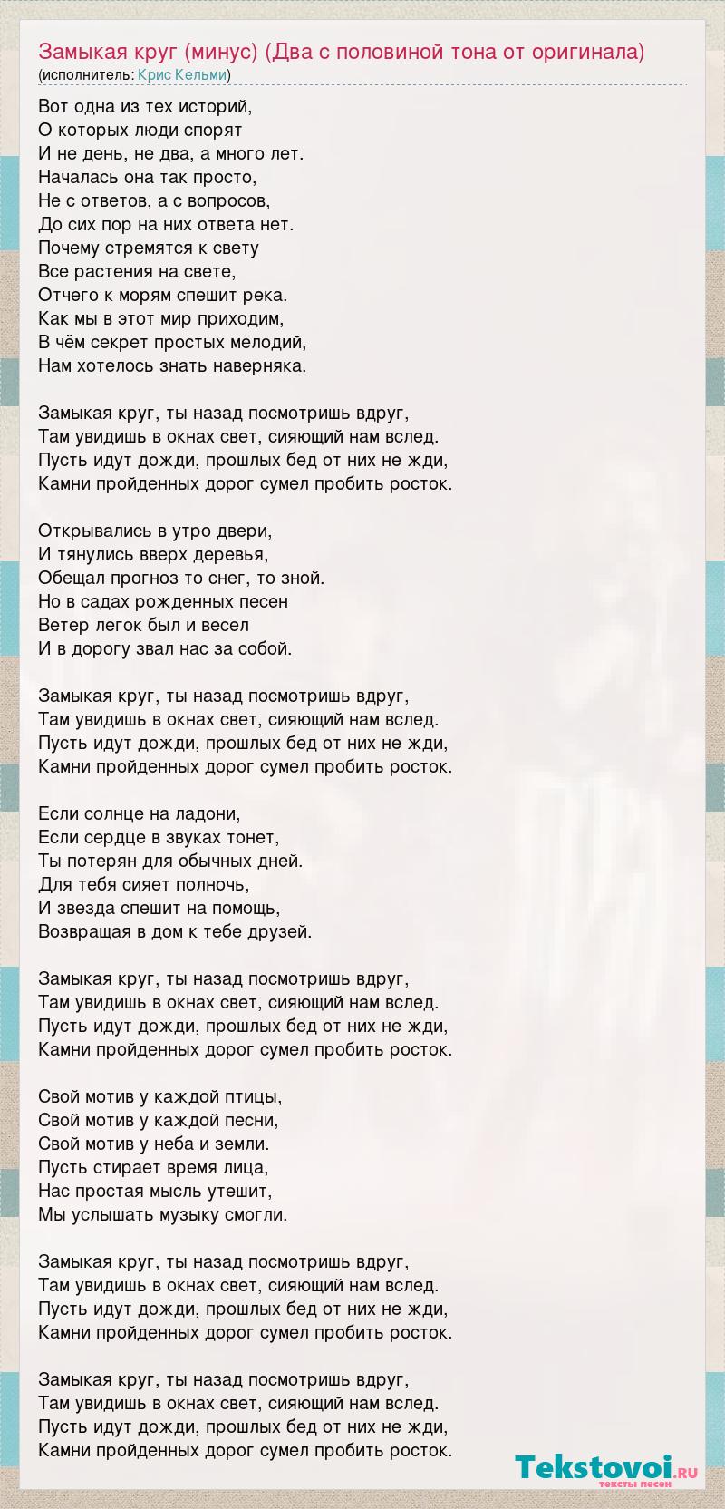 Вот одна из тех историй, О которых люди спорят И не день, не два, а много лет. Началась она так просто, Не с ответов, а с вопросов, До сих пор на них ответа нет. Почему стремятся к свету Все растения на свете, Отчего к морям спешит река. Как мы в этот мир приходим, В чём секрет простых мелодий, Нам хотелось знать наверняка. Замыкая круг, ты назад посмотришь вдруг, Там увидишь в окнах свет, сияющий нам вслед. Пусть идут дожди, прошлых бед от них не жди, Камни пройденных дорог сумел пробить росток. Открывались в утро двери, И тянулись вверх деревья, Обещал прогноз то снег, то зной. Но в садах рожденных песен Ветер легок был и весел И в дорогу звал нас за собой. Замыкая круг, ты назад посмотришь вдруг, Там увидишь в окнах свет, сияющий нам вслед. Пусть идут дожди, прошлых бед от них не жди, Камни пройденных дорог сумел пробить росток. Если солнце на ладони, Если сердце в звуках тонет, Ты потерян для обычных дней. Для тебя сияет полночь, И звезда спешит на помощь, Возвращая в дом к тебе друзей. Замыкая круг, ты назад посмотришь вдруг, Там увидишь в окнах свет, сияющий нам вслед. Пусть идут дожди, прошлых бед от них не жди, Камни пройденных дорог сумел пробить росток. Свой мотив у каждой птицы, Свой мотив у каждой песни, Свой мотив у неба и земли. Пусть стирает время лица, Нас простая мысль утешит, Мы услышать музыку смогли. Замыкая круг, ты назад посмотришь вдруг, Там увидишь в окнах свет, сияющий нам вслед. Пусть идут дожди, прошлых бед от них не жди, Камни пройденных дорог сумел пробить росток. Замыкая круг, ты назад посмотришь вдруг, Там увидишь в окнах свет, сияющий нам вслед. Пусть идут дожди, прошлых бед от них не жди, Камни пройденных дорог сумел пробить росток.