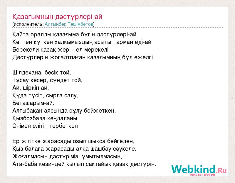 Қайта оралды қазағыма бүгін дәстүрлері-ай. Көптен күткен халкымыздың асығып арман еді-ай Берекели қазақ жері - ел мерекелі Дәстүрлерін жоғалтпаған қазағымның бұл ежелгі. Шілдехана, бесік той, Тұсау кесер, сүндет той, Ай, шіркін ай. Құда түсіп, сырға салу, Беташарым-ай. Алтыбақан аясында сұлу бойжеткен, Қызбозбала кеңдаланы Әнімен елітіп тербеткен Ер жігітке жарасады озып шықса бәйгеден, Қыз балаға жарасады алқа шашбау сәукеле. Жоғалмасын дәстүріміз, ұмытылмасын, Ата-баба көзиндей қылып сактайык қазақ дәстүрін.