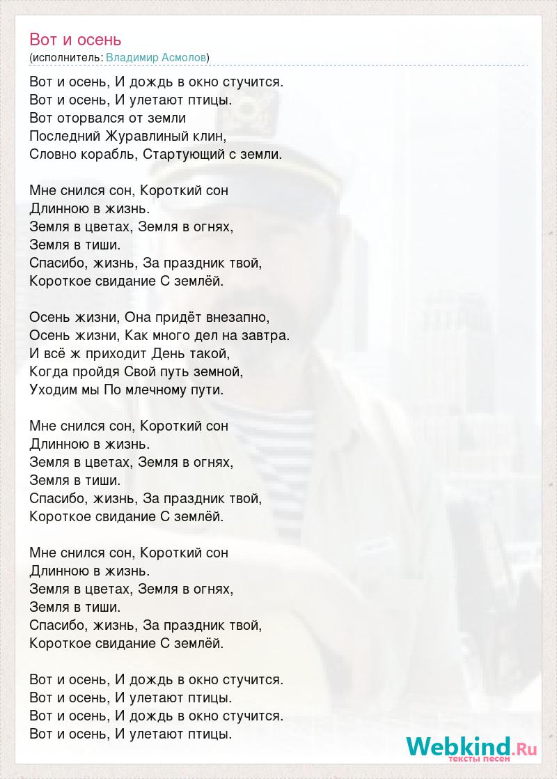 Вот и осень, И дождь в окно стучится. Вот и осень, И улетают птицы. Вот оторвался от земли Последний Журавлиный клин, Словно корабль, Стартующий с земли. Мне снился сон, Короткий сон Длинною в жизнь. Земля в цветах, Земля в огнях, Земля в тиши. Спасибо, жизнь, За праздник твой, Короткое свидание С землёй. Осень жизни, Она придёт внезапно, Осень жизни, Как много дел на завтра. И всё ж приходит День такой, Когда пройдя Свой путь земной, Уходим мы По млечному пути. Мне снился сон, Короткий сон Длинною в жизнь. Земля в цветах, Земля в огнях, Земля в тиши. Спасибо, жизнь, За праздник твой, Короткое свидание С землёй. Мне снился сон, Короткий сон Длинною в жизнь. Земля в цветах, Земля в огнях, Земля в тиши. Спасибо, жизнь, За праздник твой, Короткое свидание С землёй. Вот и осень, И дождь в окно стучится. Вот и осень, И улетают птицы. Вот и осень, И дождь в окно стучится. Вот и осень, И улетают птицы.