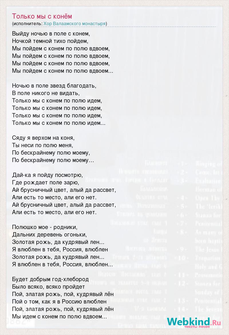 Выйду ночью в поле с конем, Ночкой темной тихо пойдем, Мы пойдем с конем по полю вдвоем, Мы пойдем с конем по полю вдвоем, Мы пойдем с конем по полю вдвоем, Мы пойдем с конем по полю вдвоем... Ночью в поле звезд благодать, В поле никого не видать, Только мы с конем по полю идем, Только мы с конем по полю идем, Только мы с конем по полю идем, Только мы с конем по полю идем... Сяду я верхом на коня, Ты неси по полю меня, По бескрайнему полю моему, По бескрайнему полю моему… Дай-ка я пойду посмотрю, Где рождает поле зарю, Ай брусничный цвет, алый да рассвет, Али есть то место, али его нет. Ай брусничный цвет, алый да рассвет, Али есть то место, али его нет. Полюшко мое - родники, Дальних деревень огоньки, Золотая рожь, да кудрявый лен... Я влюблен в тебя, Россия, влюблен Золотая рожь, да кудрявый лен... Я влюблен в тебя, Россия, влюблен... Будет добрым год-хлебород Было всяко, всяко пройдет Пой, златая рожь, пой, кудрявый лён Пой о том, как я в Россию влюблен Пой, златая рожь, пой, кудрявый лён Мы идем с конем по полю вдвоем...
