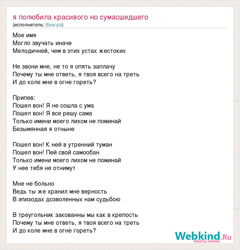 Мое имя Могло звучать иначе Мелодичней, чем в этих устах жестоких Не звони мне, не то я опять заплачу Почему ты мне ответь, я твоя всего на треть И до коле мне в огне гореть? Припев: Пошел вон! Я не сошла с ума Пошел вон! Я все решу сама Только имени моего лихом не поминай Безымянная я отныне Пошел вон! К ней в утренний туман Пошел вон! Пей свой самообан Только имени моего лихом не поминай У нее тебя не отнимут Мне не больно Ведь ты же хранил мне верность В эпизодах дозволенных нам судьбою В треугольник закованны мы как в крепость Почему ты мне ответь, я твоя всего на треть И до коле мне в огне гореть?