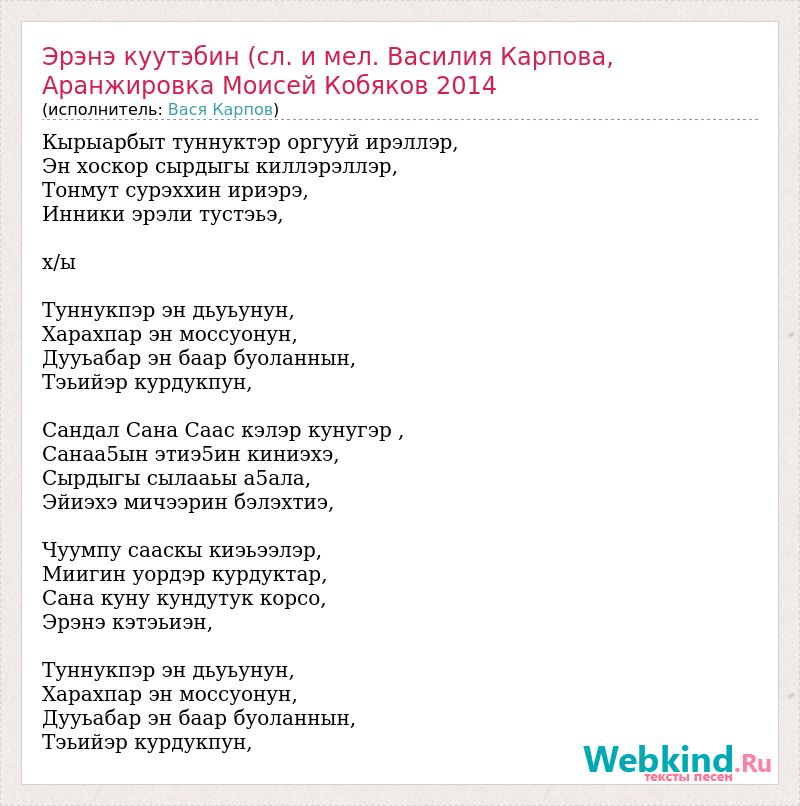 Кырыарбыт туннуктэр оргууй ирэллэр, Эн хоскор сырдыгы киллэрэллэр, Тонмут сурэххин ириэрэ, Инники эрэли тустэьэ, х/ы Туннукпэр эн дьуьунун, Харахпар эн моссуонун, Дууьабар эн баар буоланнын, Тэьийэр курдукпун, Сандал Сана Саас кэлэр кунугэр , Санаа5ын этиэ5ин киниэхэ, Сырдыгы сылааьы а5ала, Эйиэхэ мичээрин бэлэхтиэ, Чуумпу сааскы киэьээлэр, Миигин уордэр курдуктар, Сана куну кундутук корсо, Эрэнэ кэтэьиэн, Туннукпэр эн дьуьунун, Харахпар эн моссуонун, Дууьабар эн баар буоланнын, Тэьийэр курдукпун,