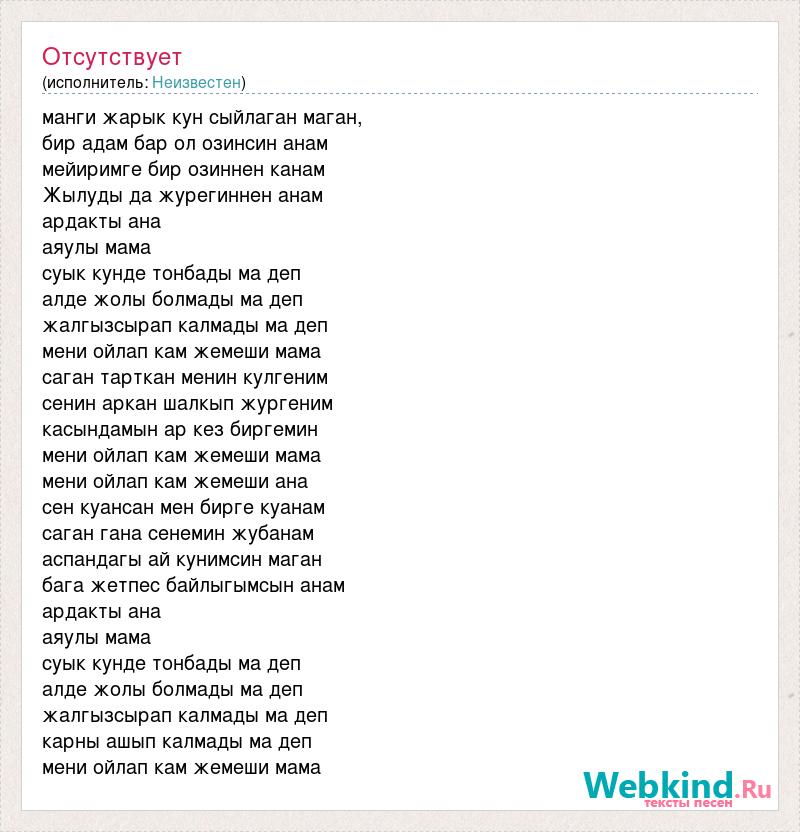 манги жарык кун сыйлаган маган, бир адам бар ол озинсин анам мейиримге бир озиннен канам Жылуды да журегиннен анам ардакты ана аяулы мама суык кунде тонбады ма деп алде жолы болмады ма деп жалгызсырап калмады ма деп мени ойлап кам жемеши мама саган тарткан менин кулгеним сенин аркан шалкып жургеним касындамын ар кез биргемин мени ойлап кам жемеши мама мени ойлап кам жемеши ана сен куансан мен бирге куанам саган гана сенемин жубанам аспандагы ай кунимсин маган бага жетпес байлыгымсын анам ардакты ана аяулы мама суык кунде тонбады ма деп алде жолы болмады ма деп жалгызсырап калмады ма деп карны ашып калмады ма деп мени ойлап кам жемеши мама