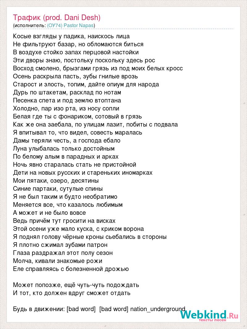 Косые взгляды у падика, наискось лица Не фильтруют базар, но обломаются биться В воздухе стойко запах перцовой настойки Эти дворы знаю, постольку поскольку здесь рос Восход смолено, брызгами грязь из под моих белых кросс Осень раскрыла пасть, зубы гнилые врозь Старост и злость, топим, дайте опиум для народа Дурь по штакетам, расклад по нотам Песенка спета и под землю втоптана Холодно, пар изо рта, из носу сопли Белая где ты с фонариком, сотовый в грязь Как же она заебала, по улицам лазит, побиты с подвала Я впитывал то, что видел, совесть маралась Дамы теряли честь, а господа ебало Луна улыбалась только достойным По белому алым в парадных и арках Ночь явно старалась стать не пристойной Дети на новых русских и стареньких иномарках Мои пятаки, озеро, десятины Синие партаки, сутулые спины Я не был таким и будто необратимо Меняется все, что казалось любимым А может и не было вовсе Ведь причём тут гросити на висках Этой осени уже мало куска, с криком ворона Я поднял голову чёрные кроны сьебались в стороны Я плотно сжимал зубами патрон Глаза раздражал этот полу сезон Молча, кивали знакомые рожи Еле справляясь с болезненной дрожью Может попозже, ещё чуть-чуть подождать И тот, кто должен вдруг сможет отдать Будь в движении: [bad word] [bad word] nation_underground