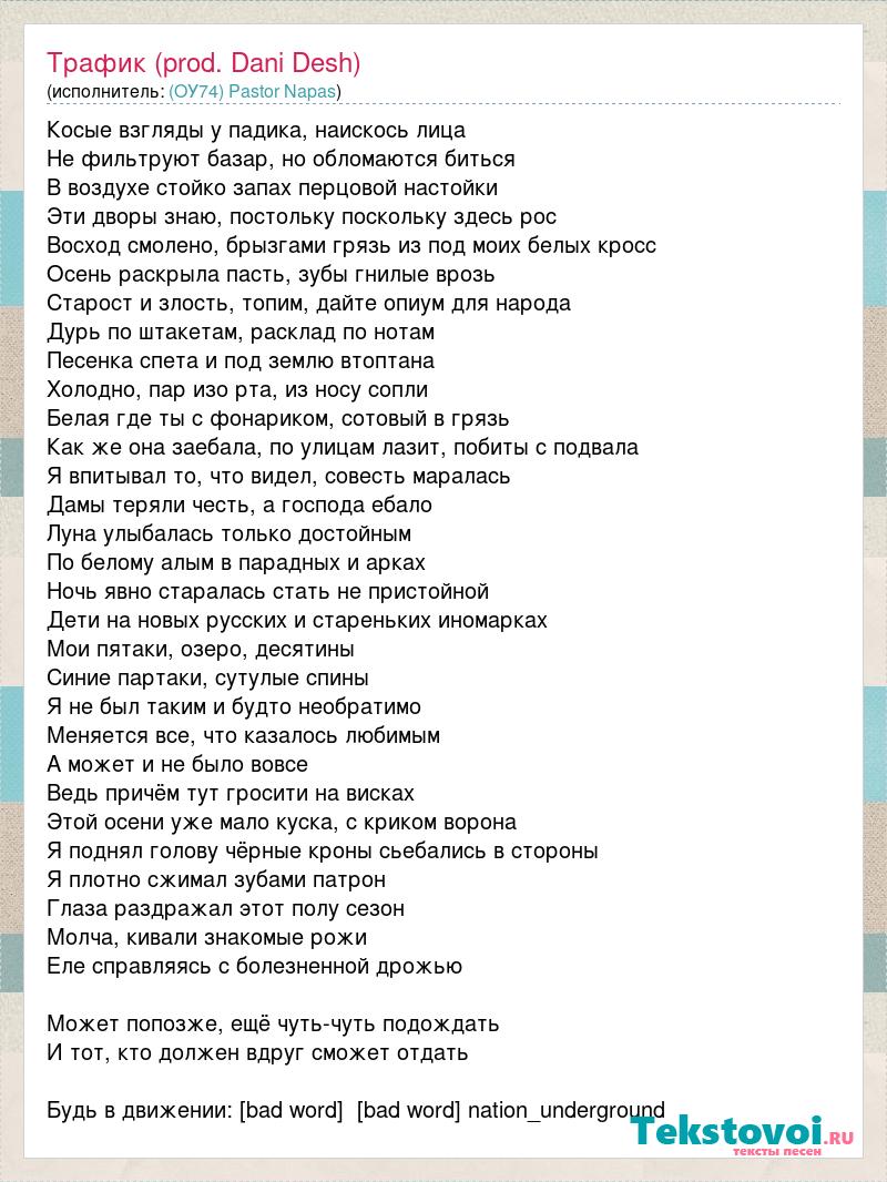 Косые взгляды у падика, наискось лица Не фильтруют базар, но обломаются биться В воздухе стойко запах перцовой настойки Эти дворы знаю, постольку поскольку здесь рос Восход смолено, брызгами грязь из под моих белых кросс Осень раскрыла пасть, зубы гнилые врозь Старост и злость, топим, дайте опиум для народа Дурь по штакетам, расклад по нотам Песенка спета и под землю втоптана Холодно, пар изо рта, из носу сопли Белая где ты с фонариком, сотовый в грязь Как же она заебала, по улицам лазит, побиты с подвала Я впитывал то, что видел, совесть маралась Дамы теряли честь, а господа ебало Луна улыбалась только достойным По белому алым в парадных и арках Ночь явно старалась стать не пристойной Дети на новых русских и стареньких иномарках Мои пятаки, озеро, десятины Синие партаки, сутулые спины Я не был таким и будто необратимо Меняется все, что казалось любимым А может и не было вовсе Ведь причём тут гросити на висках Этой осени уже мало куска, с криком ворона Я поднял голову чёрные кроны сьебались в стороны Я плотно сжимал зубами патрон Глаза раздражал этот полу сезон Молча, кивали знакомые рожи Еле справляясь с болезненной дрожью Может попозже, ещё чуть-чуть подождать И тот, кто должен вдруг сможет отдать Будь в движении: [bad word] [bad word] nation_underground