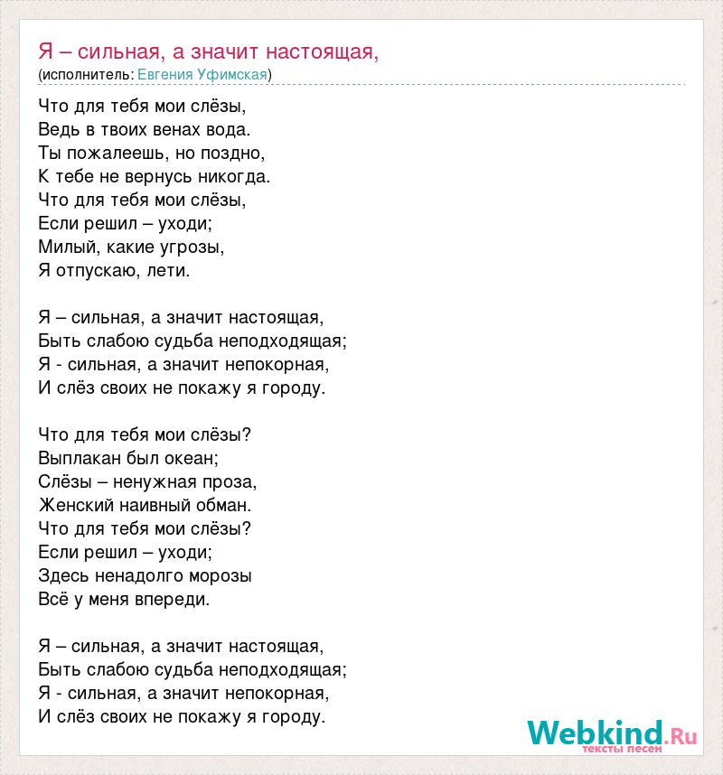 Что для тебя мои слёзы, Ведь в твоих венах вода. Ты пожалеешь, но поздно, К тебе не вернусь никогда. Что для тебя мои слёзы, Если решил – уходи; Милый, какие угрозы, Я отпускаю, лети. Я – сильная, а значит настоящая, Быть слабою судьба неподходящая; Я - сильная, а значит непокорная, И слёз своих не покажу я городу. Что для тебя мои слёзы? Выплакан был океан; Слёзы – ненужная проза, Женский наивный обман. Что для тебя мои слёзы? Если решил – уходи; Здесь ненадолго морозы Всё у меня впереди. Я – сильная, а значит настоящая, Быть слабою судьба неподходящая; Я - сильная, а значит непокорная, И слёз своих не покажу я городу.