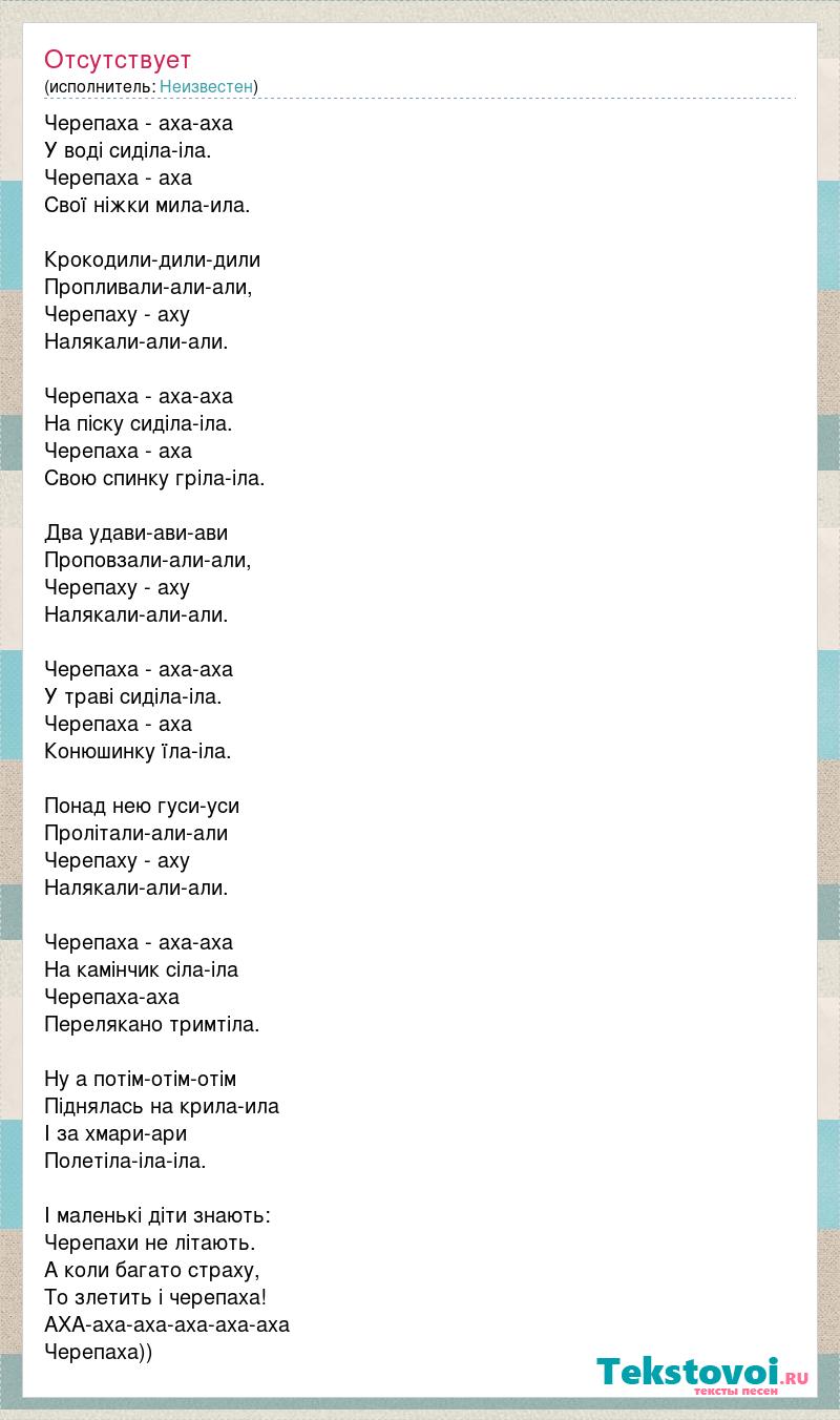 Черепаха - аха-аха У воді сиділа-іла. Черепаха - аха Свої ніжки мила-ила. Крокодили-дили-дили Пропливали-али-али, Черепаху - аху Налякали-али-али. Черепаха - аха-аха На піску сиділа-іла. Черепаха - аха Свою спинку гріла-іла. Два удави-ави-ави Проповзали-али-али, Черепаху - аху Налякали-али-али. Черепаха - аха-аха У траві сиділа-іла. Черепаха - аха Конюшинку їла-іла. Понад нею гуси-уси Пролітали-али-али Черепаху - аху Налякали-али-али. Черепаха - аха-аха На камінчик сіла-іла Черепаха-аха Перелякано тримтiла. Ну а потім-отім-отім Пiднялась на крила-ила І за хмари-ари Полетіла-іла-іла. І маленькі діти знають: Черепахи не літають. А коли багато страху, То злетить і черепаха! АХА-аха-аха-аха-аха-аха Черепаха))