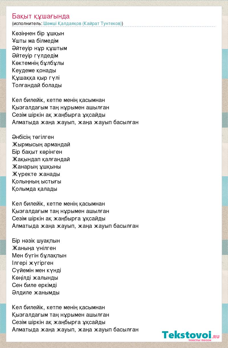 Көзіңнен бір ұшқын Ұшты ма білмедім Әйтеуір нұр құштым Әйтеуір гүлдедім Көктемнің бұлбұлы Кеудеме қонады Құшаққа қыр гүлі Толғандай болады Кел билейік, кетпе менің қасымнан Қызғалдағым таң нұрымен ашылған Сезім шіркін ақ жаңбырға ұқсайды Алматыда жаңа жауып, жаңа жауып басылған Әнбісің төгілген Жырмысың армандай Бір бақыт көрінген Жақындап қалғандай Жанарың ұшқыны Жүректе жанады Қолыңның ыстығы Қолымда қалады Кел билейік, кетпе менің қасымнан Қызғалдағым таң нұрымен ашылған Сезім шіркін ақ жаңбырға ұқсайды Алматыда жаңа жауып, жаңа жауып басылған Бір нәзік шуақпын Жаныңа үнілген Мен бүгін бұлақпын Ілгері жүгірген Сүйемін мен күнді Көңілді жалынды Сен биле еркімді Әлдиле жанымды Кел билейік, кетпе менің қасымнан Қызғалдағым таң нұрымен ашылған Сезім шіркін ақ жаңбырға ұқсайды Алматыда жаңа жауып, жаңа жауып басылған