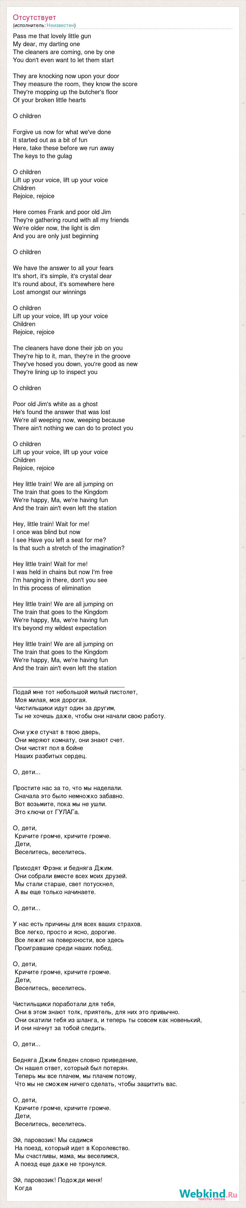 Pass me that lovely little gun My dear, my darting one The cleaners are coming, one by one You don't even want to let them start They are knocking now upon your door They measure the room, they know the score They're mopping up the butcher's floor Of your broken little hearts O children Forgive us now for what we've done It started out as a bit of fun Here, take these before we run away The keys to the gulag O children Lift up your voice, lift up your voice Children Rejoice, rejoice Here comes Frank and poor old Jim They're gathering round with all my friends We're older now, the light is dim And you are only just beginning O children We have the answer to all your fears It's short, it's simple, it's crystal dear It's round about, it's somewhere here Lost amongst our winnings O children Lift up your voice, lift up your voice Children Rejoice, rejoice The cleaners have done their job on you They're hip to it, man, they're in the groove They've hosed you down, you're good as new They're lining up to inspect you O children Poor old Jim's white as a ghost He's found the answer that was lost We're all weeping now, weeping because There ain't nothing we can do to protect you O children Lift up your voice, lift up your voice Children Rejoice, rejoice Hey little train! We are all jumping on The train that goes to the Kingdom We're happy, Ma, we're having fun And the train ain't even left the station Hey, little train! Wait for me! I once was blind but now I see Have you left a seat for me? Is that such a stretch of the imagination? Hey little train! Wait for me! I was held in chains but now I'm free I'm hanging in there, don't you see In this process of elimination Hey little train! We are all jumping on The train that goes to the Kingdom We're happy, Ma, we're having fun It's beyond my wildest expectation Hey little train! We are all jumping on The train that goes to the Kingdom We're happy, Ma, we're having fun And the train ain't even left the station _________________________________ Подай мне тот небольшой милый пистолет, Моя милая, моя дорогая. Чистильщики идут один за другим, Ты не хочешь даже, чтобы они начали свою работу. Они уже стучат в твою дверь, Они меряют комнату, они знают счет. Они чистят пол в бойне Наших разбитых сердец. О, дети... Простите нас за то, что мы наделали. Сначала это было немножко забавно. Вот возьмите, пока мы не ушли. Это ключи от ГУЛАГа. О, дети, Кричите громче, кричите громче. Дети, Веселитесь, веселитесь. Приходят Фрэнк и бедняга Джим. Они собрали вместе всех моих друзей. Мы стали старше, свет потускнел, А вы еще только начинаете. О, дети... У нас есть причины для всех ваших страхов. Все легко, просто и ясно, дорогие. Все лежит на поверхности, все здесь Проигравшие среди наших побед. О, дети, Кричите громче, кричите громче. Дети, Веселитесь, веселитесь. Чистильщики поработали для тебя, Они в этом знают толк, приятель, для них это привычно. Они окатили тебя из шланга, и теперь ты совсем как новенький, И они начнут за тобой следить. О, дети... Бедняга Джим бледен словно приведение, Он нашел ответ, который был потерян. Теперь мы все плачем, мы плачем потому, Что мы не сможем ничего сделать, чтобы защитить вас. О, дети, Кричите громче, кричите громче. Дети, Веселитесь, веселитесь. Эй, паровозик! Мы садимся На поезд, который идет в Королевство. Мы счастливы, мама, мы веселимся, А поезд еще даже не тронулся. Эй, паровозик! Подожди меня! Когда
