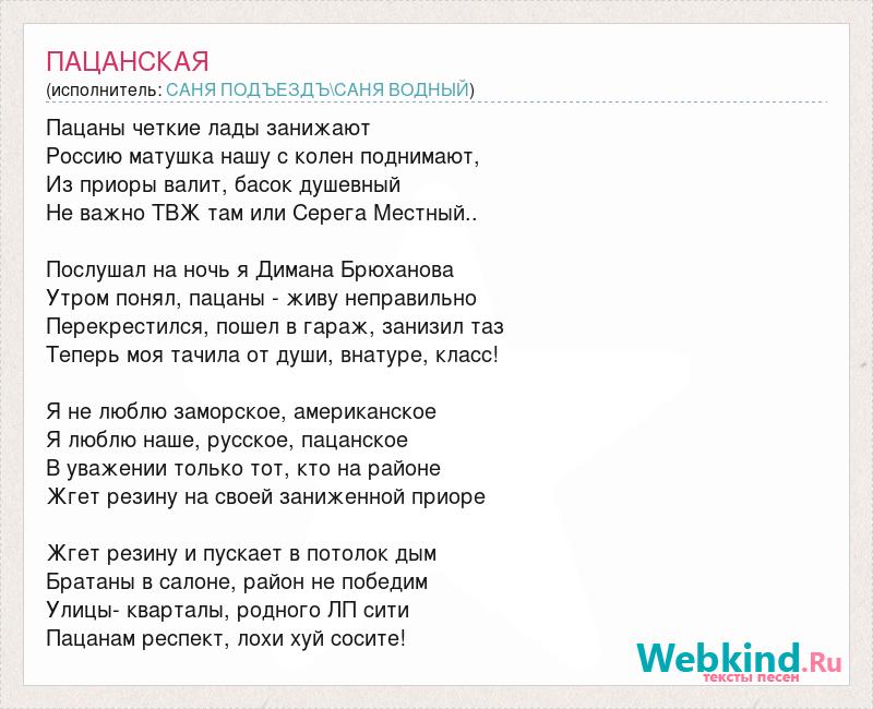 Пацаны четкие лады занижают Россию матушка нашу с колен поднимают, Из приоры валит, басок душевный Не важно ТВЖ там или Серега Местный.. Послушал на ночь я Димана Брюханова Утром понял, пацаны - живу неправильно Перекрестился, пошел в гараж, занизил таз Теперь моя тачила от души, внатуре, класс! Я не люблю заморское, американское Я люблю наше, русское, пацанское В уважении только тот, кто на районе Жгет резину на своей заниженной приоре Жгет резину и пускает в потолок дым Братаны в салоне, район не победим Улицы- кварталы, родного ЛП сити Пацанам респект, лохи хуй сосите!