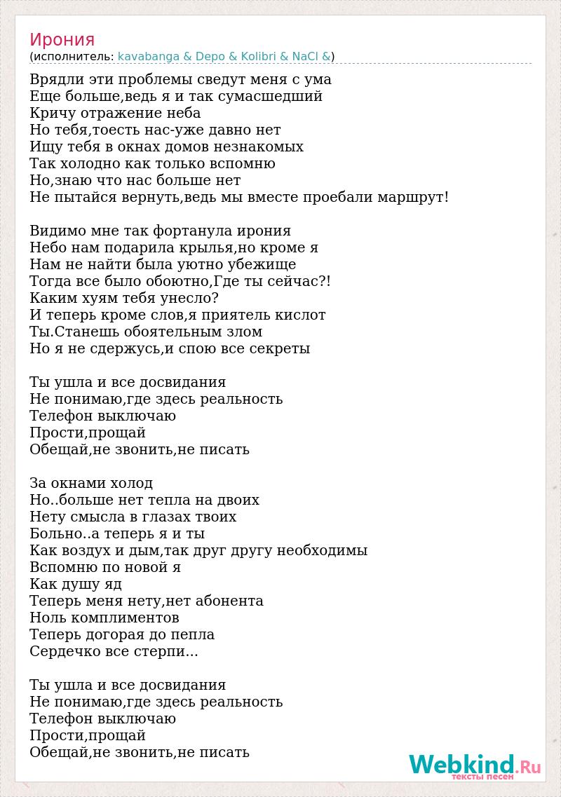 Врядли эти проблемы сведут меня с ума Еще больше,ведь я и так сумасшедший Кричу отражение неба Но тебя,тоесть нас-уже давно нет Ищу тебя в окнах домов незнакомых Так холодно как только вспомню Но,знаю что нас больше нет Не пытайся вернуть,ведь мы вместе проебали маршрут! Видимо мне так фортанула ирония Небо нам подарила крылья,но кроме я Нам не найти была уютно убежище Тогда все было обоютно,Где ты сейчас?! Каким хуям тебя унесло? И теперь кроме слов,я приятель кислот Ты.Станешь обоятельным злом Но я не сдержусь,и спою все секреты Ты ушла и все досвидания Не понимаю,где здесь реальность Телефон выключаю Прости,прощай Обещай,не звонить,не писать За окнами холод Но..больше нет тепла на двоих Нету смысла в глазах твоих Больно..а теперь я и ты Как воздух и дым,так друг другу необходимы Вспомню по новой я Как душу яд Теперь меня нету,нет абонента Ноль комплиментов Теперь догорая до пепла Сердечко все стерпи... Ты ушла и все досвидания Не понимаю,где здесь реальность Телефон выключаю Прости,прощай Обещай,не звонить,не писать