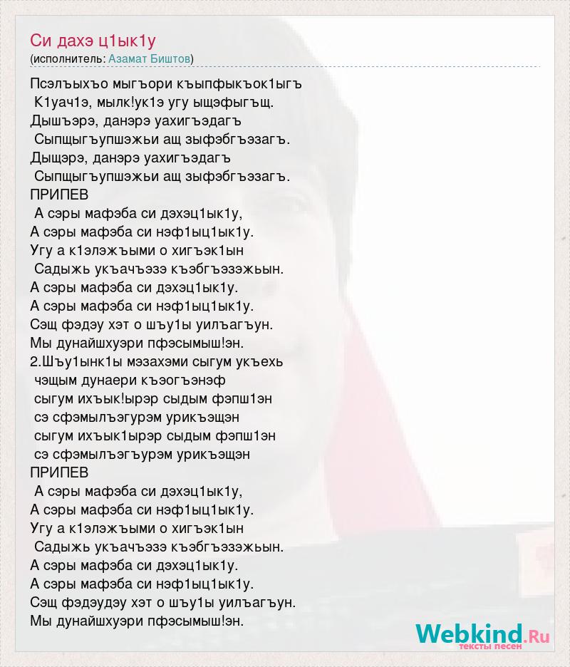 Псэлъыхъо мыгъори къыпфыкъок1ыгъ К1уач1э, мылк!ук1э угу ыщэфыгъщ. Дышъэрэ, данэрэ уахигъэдагъ Сыпщыгъупшэжьи ащ зыфэбгъэзагъ. Дыщэрэ, данэрэ уахигъэдагъ Сыпщыгъупшэжьи ащ зыфэбгъэзагъ. ПРИПЕВ А сэры мафэба си дэхэц1ык1у, А сэры мафэба си нэф1ыц1ык1у. Угу а к1элэжъыми о хигъэк1ын Садыжь укъачъэзэ къэбгъэзэжьын. А сэры мафэба си дэхэц1ык1у. А сэры мафэба си нэф1ыц1ык1у. Сэщ фэдэу хэт о шъу1ы уилъагъун. Мы дунайшхуэри пфэсымыш!эн. 2.Шъу1ынк1ы мэзахэми сыгум укъехь чэщым дунаери къэогъэнэф сыгум ихъык!ырэр сыдым фэпш1эн сэ сфэмылъэгурэм урикъэщэн сыгум ихъык1ырэр сыдым фэпш1эн сэ сфэмылъэгъурэм урикъэщэн ПРИПЕВ А сэры мафэба си дэхэц1ык1у, А сэры мафэба си нэф1ыц1ык1у. Угу а к1элэжъыми о хигъэк1ын Садыжь укъачъэзэ къэбгъэзэжьын. А сэры мафэба си дэхэц1ык1у. А сэры мафэба си нэф1ыц1ык1у. Сэщ фэдэудэу хэт о шъу1ы уилъагъун. Мы дунайшхуэри пфэсымыш!эн.
