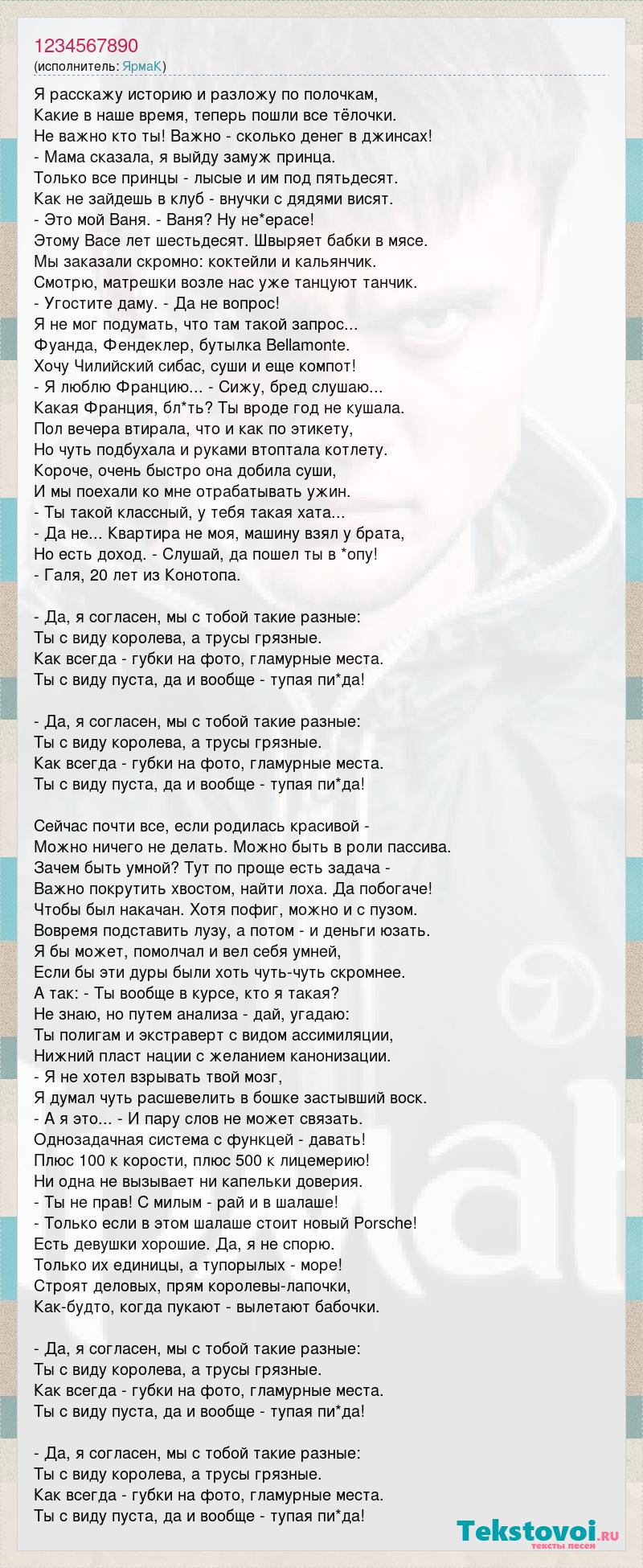 Я расскажу историю и разложу по полочкам, Какие в наше время, теперь пошли все тёлочки. Не важно кто ты! Важно - сколько денег в джинсах! - Мама сказала, я выйду замуж принца. Только все принцы - лысые и им под пятьдесят. Как не зайдешь в клуб - внучки с дядями висят. - Это мой Ваня. - Ваня? Ну не*ерасе! Этому Васе лет шестьдесят. Швыряет бабки в мясе. Мы заказали скромно: коктейли и кальянчик. Смотрю, матрешки возле нас уже танцуют танчик. - Угостите даму. - Да не вопрос! Я не мог подумать, что там такой запрос... Фуанда, Фендеклер, бутылка Bellamonte. Хочу Чилийский сибас, суши и еще компот! - Я люблю Францию... - Сижу, бред слушаю... Какая Франция, бл*ть? Ты вроде год не кушала. Пол вечера втирала, что и как по этикету, Но чуть подбухала и руками втоптала котлету. Короче, очень быстро она добила суши, И мы поехали ко мне отрабатывать ужин. - Ты такой классный, у тебя такая хата... - Да не... Квартира не моя, машину взял у брата, Но есть доход. - Слушай, да пошел ты в *опу! - Галя, 20 лет из Конотопа. - Да, я согласен, мы с тобой такие разные: Ты с виду королева, а трусы грязные. Как всегда - губки на фото, гламурные места. Ты с виду пуста, да и вообще - тупая пи*да! - Да, я согласен, мы с тобой такие разные: Ты с виду королева, а трусы грязные. Как всегда - губки на фото, гламурные места. Ты с виду пуста, да и вообще - тупая пи*да! Сейчас почти все, если родилась красивой - Можно ничего не делать. Можно быть в роли пассива. Зачем быть умной? Тут по проще есть задача - Важно покрутить хвостом, найти лоха. Да побогаче! Чтобы был накачан. Хотя пофиг, можно и с пузом. Вовремя подставить лузу, а потом - и деньги юзать. Я бы может, помолчал и вел себя умней, Если бы эти дуры были хоть чуть-чуть скромнее. А так: - Ты вообще в курсе, кто я такая? Не знаю, но путем анализа - дай, угадаю: Ты полигам и экстраверт с видом ассимиляции, Нижний пласт нации с желанием канонизации. - Я не хотел взрывать твой мозг, Я думал чуть расшевелить в бошке застывший воск. - А я это... - И пару слов не может связать. Однозадачная система с функцей - давать! Плюс 100 к корости, плюс 500 к лицемерию! Ни одна не вызывает ни капельки доверия. - Ты не прав! С милым - рай и в шалаше! - Только если в этом шалаше стоит новый Porsche! Есть девушки хорошие. Да, я не спорю. Только их единицы, а тупорылых - море! Строят деловых, прям королевы-лапочки, Как-будто, когда пукают - вылетают бабочки. - Да, я согласен, мы с тобой такие разные: Ты с виду королева, а трусы грязные. Как всегда - губки на фото, гламурные места. Ты с виду пуста, да и вообще - тупая пи*да! - Да, я согласен, мы с тобой такие разные: Ты с виду королева, а трусы грязные. Как всегда - губки на фото, гламурные места. Ты с виду пуста, да и вообще - тупая пи*да!