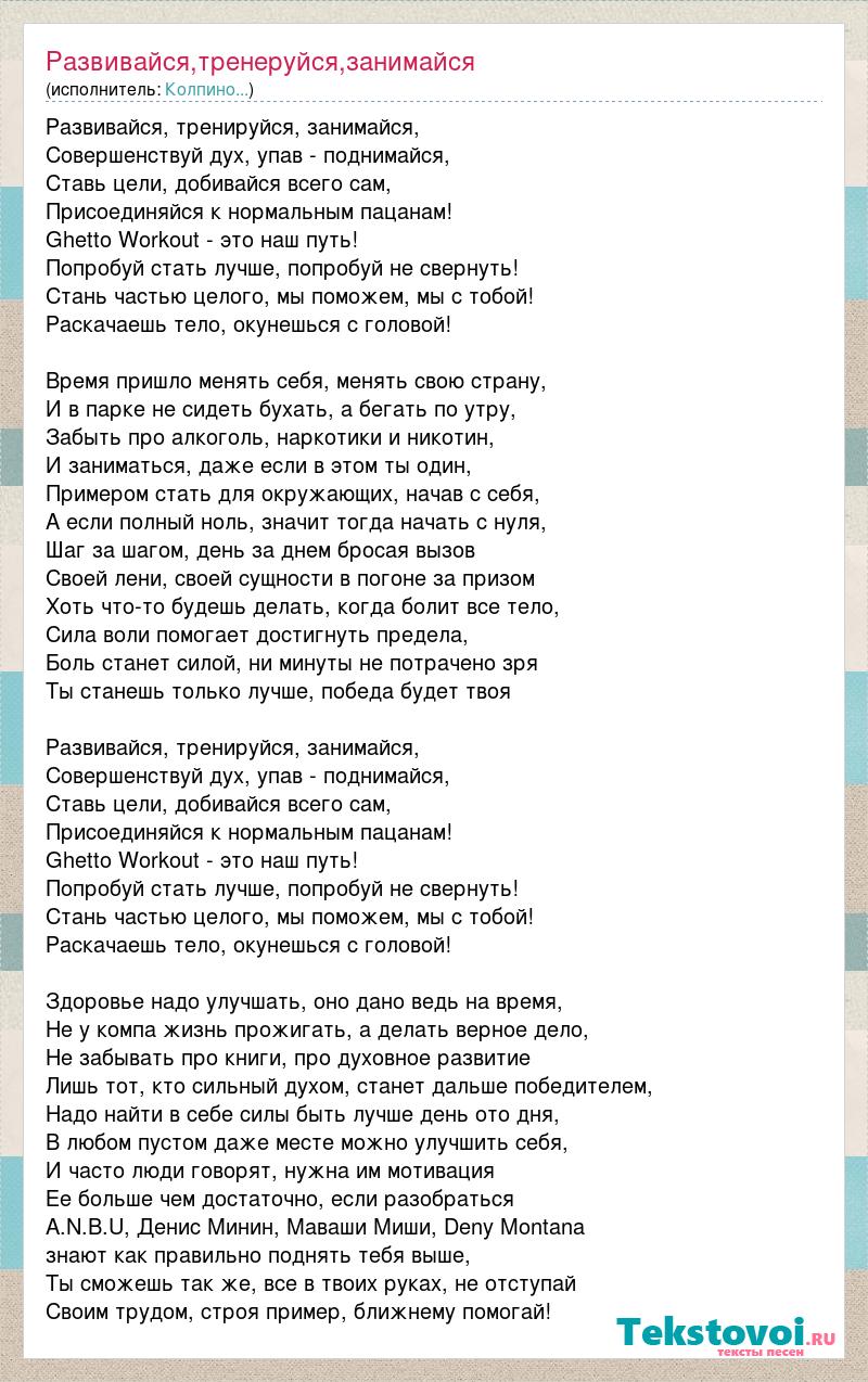 Развивайся, тренируйся, занимайся, Совершенствуй дух, упав - поднимайся, Ставь цели, добивайся всего сам, Присоединяйся к нормальным пацанам! Ghetto Workout - это наш путь! Попробуй стать лучше, попробуй не свернуть! Стань частью целого, мы поможем, мы с тобой! Раскачаешь тело, окунешься с головой! Время пришло менять себя, менять свою страну, И в парке не сидеть бухать, а бегать по утру, Забыть про алкоголь, наркотики и никотин, И заниматься, даже если в этом ты один, Примером стать для окружающих, начав с себя, А если полный ноль, значит тогда начать с нуля, Шаг за шагом, день за днем бросая вызов Своей лени, своей сущности в погоне за призом Хоть что-то будешь делать, когда болит все тело, Сила воли помогает достигнуть предела, Боль станет силой, ни минуты не потрачено зря Ты станешь только лучше, победа будет твоя Развивайся, тренируйся, занимайся, Совершенствуй дух, упав - поднимайся, Ставь цели, добивайся всего сам, Присоединяйся к нормальным пацанам! Ghetto Workout - это наш путь! Попробуй стать лучше, попробуй не свернуть! Стань частью целого, мы поможем, мы с тобой! Раскачаешь тело, окунешься с головой! Здоровье надо улучшать, оно дано ведь на время, Не у компа жизнь прожигать, а делать верное дело, Не забывать про книги, про духовное развитие Лишь тот, кто сильный духом, станет дальше победителем, Надо найти в себе силы быть лучше день ото дня, В любом пустом даже месте можно улучшить себя, И часто люди говорят, нужна им мотивация Ее больше чем достаточно, если разобраться A.N.B.U, Денис Минин, Маваши Миши, Deny Montana знают как правильно поднять тебя выше, Ты сможешь так же, все в твоих руках, не отступай Своим трудом, строя пример, ближнему помогай!