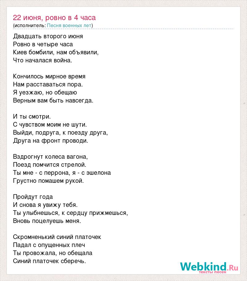 Двадцать второго июня Ровно в четыре часа Киев бомбили, нам объявили, Что началася война. Кончилось мирное время Нам расставаться пора. Я уезжаю, но обещаю Верным вам быть навсегда. И ты смотри. С чувством моим не шути. Выйди, подруга, к поезду друга, Друга на фронт проводи. Вздрогнут колеса вагона, Поезд помчится стрелой. Ты мне - с перрона, я - с эшелона Грустно помашем рукой. Пройдут года И снова я увижу тебя. Ты улыбнешься, к сердцу прижмешься, Вновь поцелуешь меня. Скромненький синий платочек Падал с опущенных плеч Ты провожала, но обещала Синий платочек сберечь.