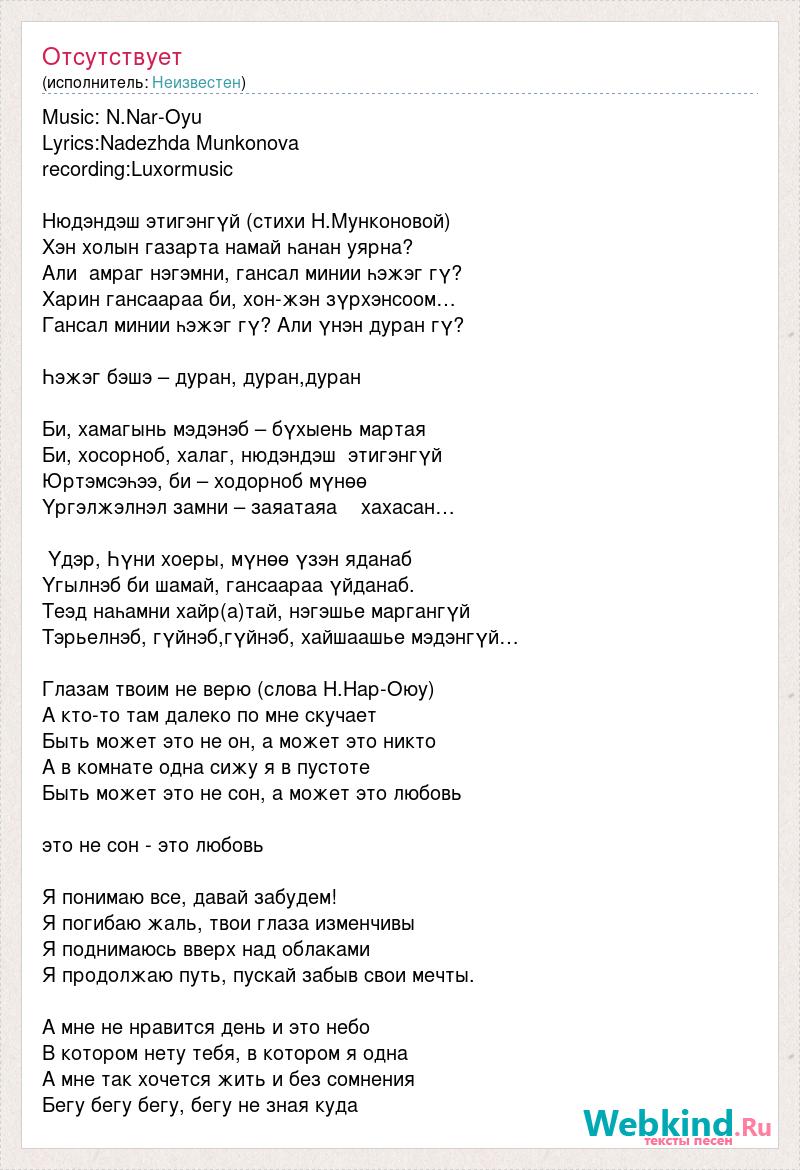Music: N.Nar-Oyu Lyrics:Nadezhda Munkonova recording:Luxormusic Нюдэндэш этигэнгүй (стихи Н.Мунконовой) Хэн холын газарта намай һанан уярна? Али амраг нэгэмни, гансал минии һэжэг гү? Харин гансаараа би, хон-жэн зүрхэнсоом… Гансал минии һэжэг гү? Али үнэн дуран гү? Һэжэг бэшэ – дуран, дуран,дуран Би, хамагынь мэдэнэб – бүхыень мартая Би, хосорноб, халаг, нюдэндэш этигэнгүй Юртэмсэһээ, би – ходорноб мүнөө Үргэлжэлнэл замни – заяатаяа хахасан… Үдэр, Һүни хоеры, мүнөө үзэн яданаб Үгылнэб би шамай, гансаараа үйданаб. Теэд наһамни хайр(а)тай, нэгэшье маргангүй Тэрьелнэб, гүйнэб,гүйнэб, хайшаашье мэдэнгүй… Глазам твоим не верю (слова Н.Нар-Оюу) А кто-то там далеко по мне скучает Быть может это не он, а может это никто А в комнате одна сижу я в пустоте Быть может это не сон, а может это любовь это не сон - это любовь Я понимаю все, давай забудем! Я погибаю жаль, твои глаза изменчивы Я поднимаюсь вверх над облаками Я продолжаю путь, пускай забыв свои мечты. А мне не нравится день и это небо В котором нету тебя, в котором я одна А мне так хочется жить и без сомнения Бегу бегу бегу, бегу не зная куда