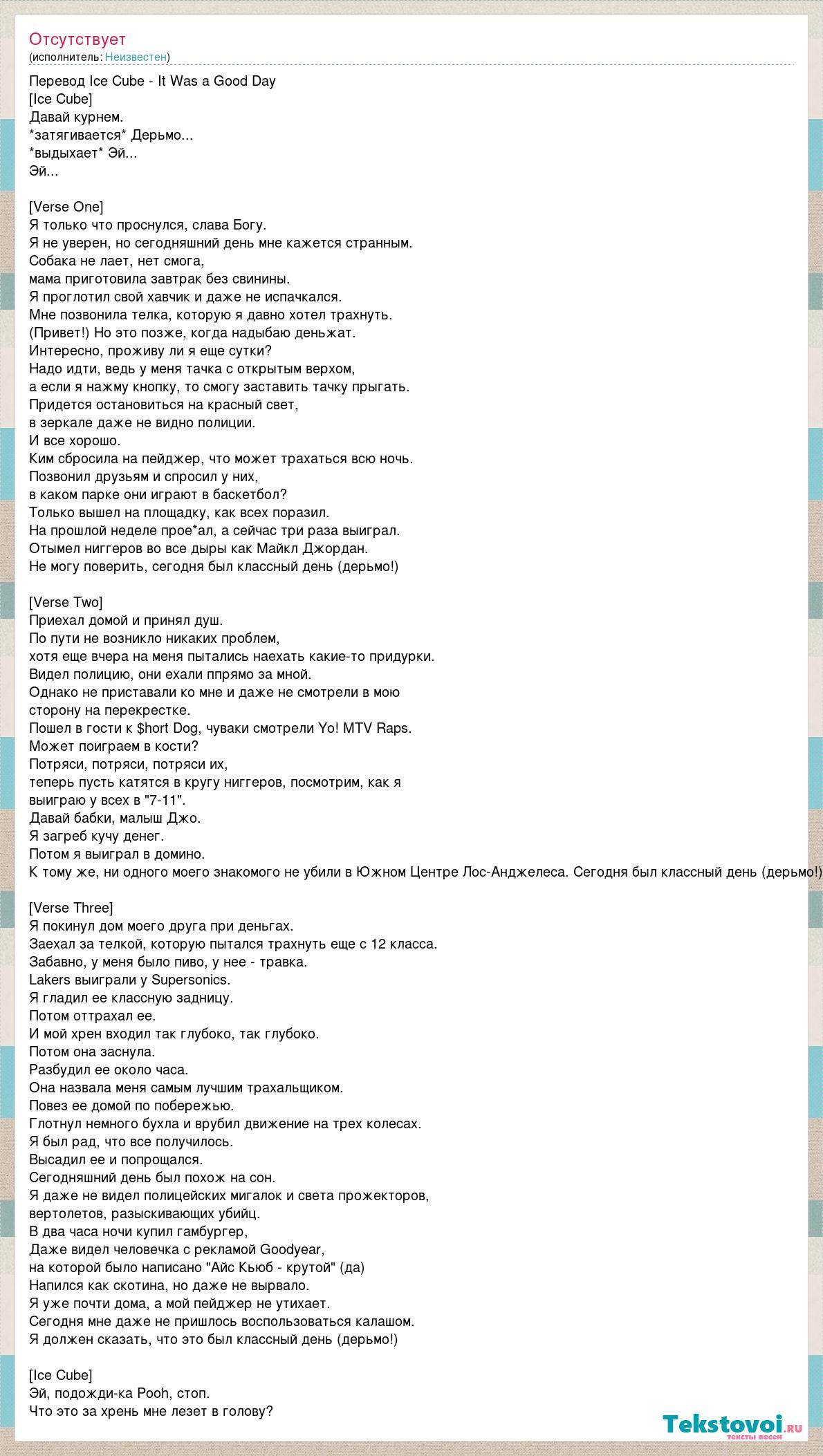 Перевод Ice Cube - It Was a Good Day [Ice Cube] Давай курнем. *затягивается* Дерьмо... *выдыхает* Эй... Эй... [Verse One] Я только что проснулся, слава Богу. Я не уверен, но сегодняшний день мне кажется странным. Собака не лает, нет смога, мама приготовила завтрак без свинины. Я проглотил свой хавчик и даже не испачкался. Мне позвонила телка, которую я давно хотел трахнуть. (Привет!) Но это позже, когда надыбаю деньжат. Интересно, проживу ли я еще сутки? Надо идти, ведь у меня тачка с открытым верхом, а если я нажму кнопку, то смогу заставить тачку прыгать. Придется остановиться на красный свет, в зеркале даже не видно полиции. И все хорошо. Ким сбросила на пейджер, что может трахаться всю ночь. Позвонил друзьям и спросил у них, в каком парке они играют в баскетбол? Только вышел на площадку, как всех поразил. На прошлой неделе прое*ал, а сейчас три раза выиграл. Отымел ниггеров во все дыры как Майкл Джордан. Не могу поверить, сегодня был классный день (дерьмо!) [Verse Two] Приехал домой и принял душ. По пути не возникло никаких проблем, хотя еще вчера на меня пытались наехать какие-то придурки. Видел полицию, они ехали ппрямо за мной. Однако не приставали ко мне и даже не смотрели в мою сторону на перекрестке. Пошел в гости к $hort Dog, чуваки смотрели Yo! MTV Raps. Может поиграем в кости? Потряси, потряси, потряси их, теперь пусть катятся в кругу ниггеров, посмотрим, как я выиграю у всех в "7-11". Давай бабки, малыш Джо. Я загреб кучу денег. Потом я выиграл в домино. К тому же, ни одного моего знакомого не убили в Южном Центре Лос-Анджелеса. Сегодня был классный день (дерьмо!) [Verse Three] Я покинул дом моего друга при деньгах. Заехал за телкой, которую пытался трахнуть еще с 12 класса. Забавно, у меня было пиво, у нее - травка. Lakers выиграли у Supersonics. Я гладил ее классную задницу. Потом оттрахал ее. И мой хрен входил так глубоко, так глубоко. Потом она заснула. Разбудил ее около часа. Она назвала меня самым лучшим трахальщиком. Повез ее домой по побережью. Глотнул немного бухла и врубил движение на трех колесах. Я был рад, что все получилось. Высадил ее и попрощался. Сегодняшний день был похож на сон. Я даже не видел полицейских мигалок и света прожекторов, вертолетов, разыскивающих убийц. В два часа ночи купил гамбургер, Даже видел человечка с рекламой Goodyear, на которой было написано "Айс Кьюб - крутой" (да) Напился как скотина, но даже не вырвало. Я уже почти дома, а мой пейджер не утихает. Сегодня мне даже не пришлось воспользоваться калашом. Я должен сказать, что это был классный день (дерьмо!) [Ice Cube] Эй, подожди-ка Pooh, стоп. Что это за хрень мне лезет в голову?