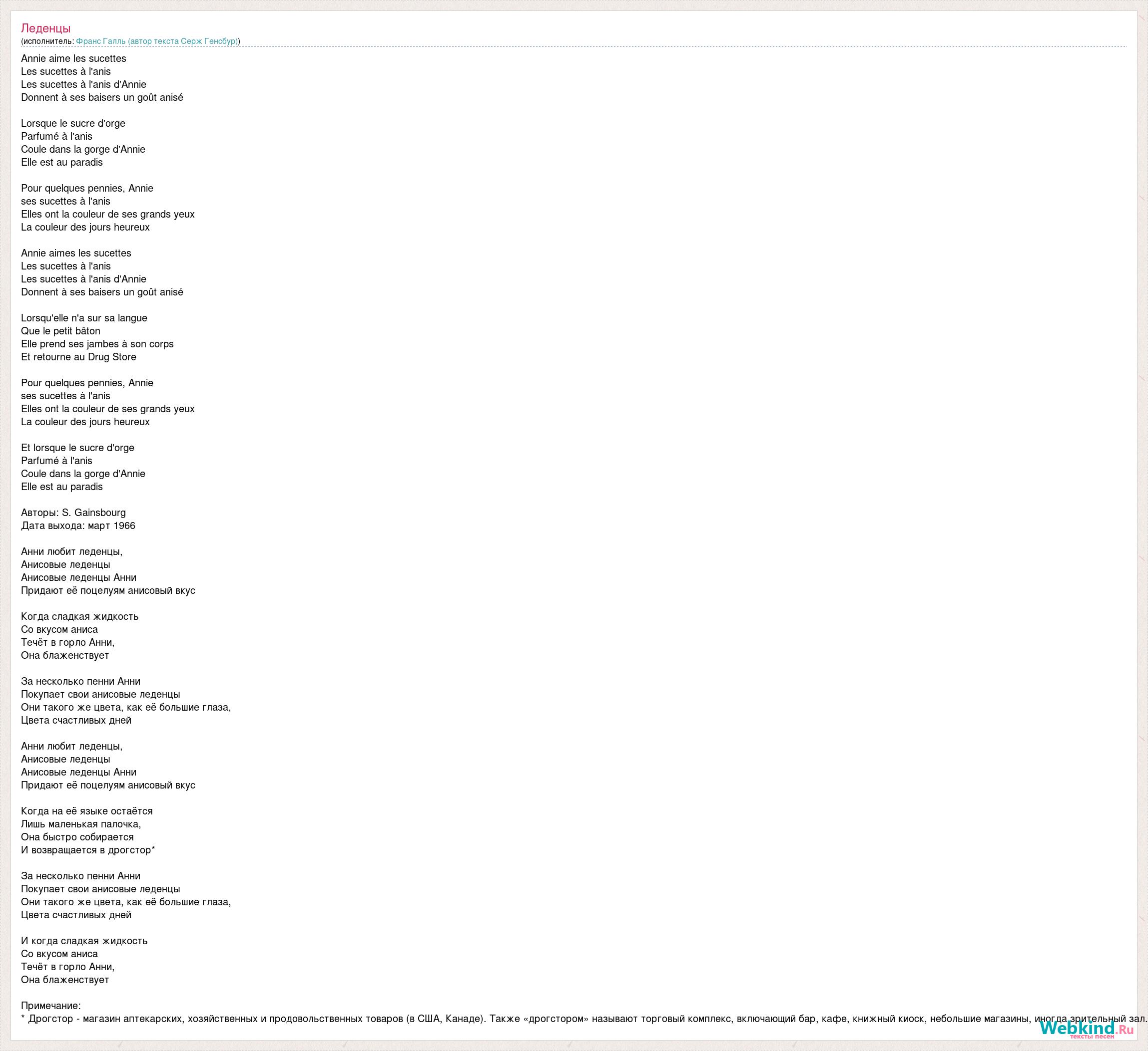 Annie aime les sucettes Les sucettes à l'anis Les sucettes à l'anis d'Annie Donnent à ses baisers un goût anisé Lorsque le sucre d'orge Parfumé à l'anis Coule dans la gorge d'Annie Elle est au paradis Pour quelques pennies, Annie ses sucettes à l'anis Elles ont la couleur de ses grands yeux La couleur des jours heureux Annie aimes les sucettes Les sucettes à l'anis Les sucettes à l'anis d'Annie Donnent à ses baisers un goût anisé Lorsqu'elle n'a sur sa langue Que le petit bâton Elle prend ses jambes à son corps Et retourne au Drug Store Pour quelques pennies, Annie ses sucettes à l'anis Elles ont la couleur de ses grands yeux La couleur des jours heureux Et lorsque le sucre d'orge Parfumé à l'anis Coule dans la gorge d'Annie Elle est au paradis Авторы: S. Gainsbourg Дата выхода: март 1966 Анни любит леденцы, Анисовые леденцы Анисовые леденцы Анни Придают её поцелуям анисовый вкус Когда сладкая жидкость Со вкусом аниса Течёт в горло Анни, Она блаженствует За несколько пенни Анни Покупает свои анисовые леденцы Они такого же цвета, как её большие глаза, Цвета счастливых дней Анни любит леденцы, Анисовые леденцы Анисовые леденцы Анни Придают её поцелуям анисовый вкус Когда на её языке остаётся Лишь маленькая палочка, Она быстро собирается И возвращается в дрогстор* За несколько пенни Анни Покупает свои анисовые леденцы Они такого же цвета, как её большие глаза, Цвета счастливых дней И когда сладкая жидкость Со вкусом аниса Течёт в горло Анни, Она блаженствует Примечание: * Дрогстор - магазин аптекарских, хозяйственных и продовольственных товаров (в США, Канаде). Также «дрогстором» называют торговый комплекс, включающий бар, кафе, книжный киоск, небольшие магазины, иногда зрительный зал.