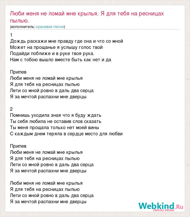 1 Дождь раскажи мне правду где она и что со мной Может на прощанье я услышу голос твой Подайди поближе и в руке твоя рука. Нам с тобою вышло вместе быть как нет и да Припев Люби меня не ломай мне крылья Я для тебя на ресницах пылью Лети со мной ровно в даль два серца Я за мечтой распахни мне дверцы 2 Помнишь уходила зная что я буду ждать Ты себя любила не оставив слов сказать Ты меня прощала только нет моей вины С каждым днем теряла в сердце место для любви Припев Люби меня не ломай мне крылья Я для тебя на ресницах пылью Лети со мной ровно в даль два серца Я за мечтой распахни мне дверцы Люби меня не ломай мне крылья Я для тебя на ресницах пылью Лети со мной ровно в даль два серца Я за мечтой распахни мне дверцы
