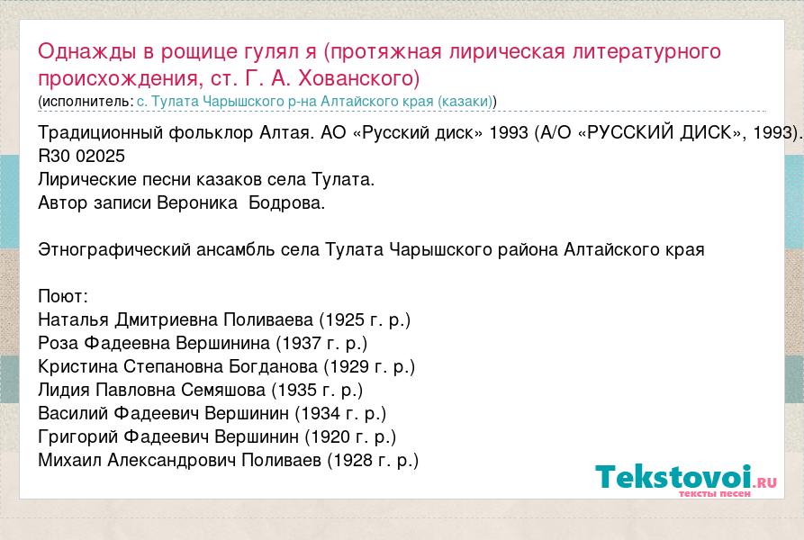 Главная→Исполнители→С. Тулата Чарышского р-на Алтайского края (казаки)→Однажды в рощице гулял я (протяжная лирическая литературного происхождения, ст.