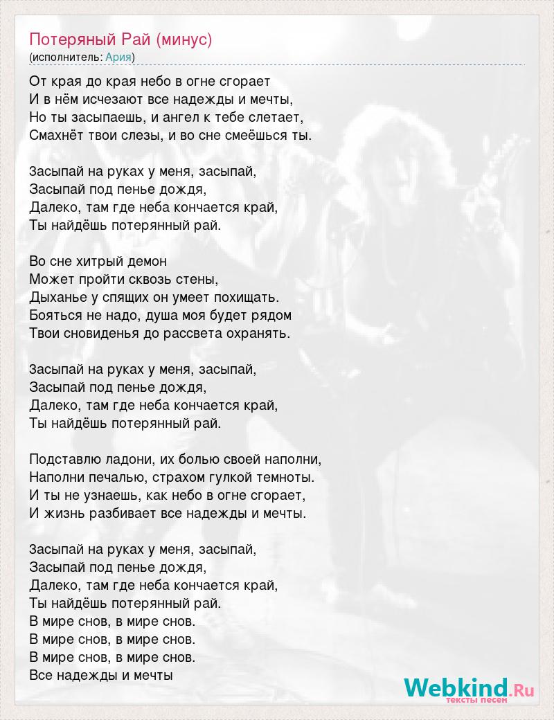 От края до края небо в огне сгорает И в нём исчезают все надежды и мечты, Но ты засыпаешь, и ангел к тебе слетает, Смахнёт твои слезы, и во сне смеёшься ты. 3асыпай на руках у меня, засыпай, Засыпай под пенье дождя, Далеко, там где неба кончается край, Ты найдёшь потерянный рай. Во сне хитрый демон Может пройти сквозь стены, Дыханье у спящих он умеет похищать. Бояться не надо, душа моя будет рядом Твои сновиденья до рассвета охранять. 3асыпай на руках у меня, засыпай, Засыпай под пенье дождя, Далеко, там где неба кончается край, Ты найдёшь потерянный рай. Подставлю ладони, их болью своей наполни, Наполни печалью, страхом гулкой темноты. И ты не узнаешь, как небо в огне сгорает, И жизнь разбивает все надежды и мечты. 3асыпай на руках у меня, засыпай, Засыпай под пенье дождя, Далеко, там где неба кончается край, Ты найдёшь потерянный рай. В мире снов, в мире снов. В мире снов, в мире снов. В мире снов, в мире снов. Все надежды и мечты
