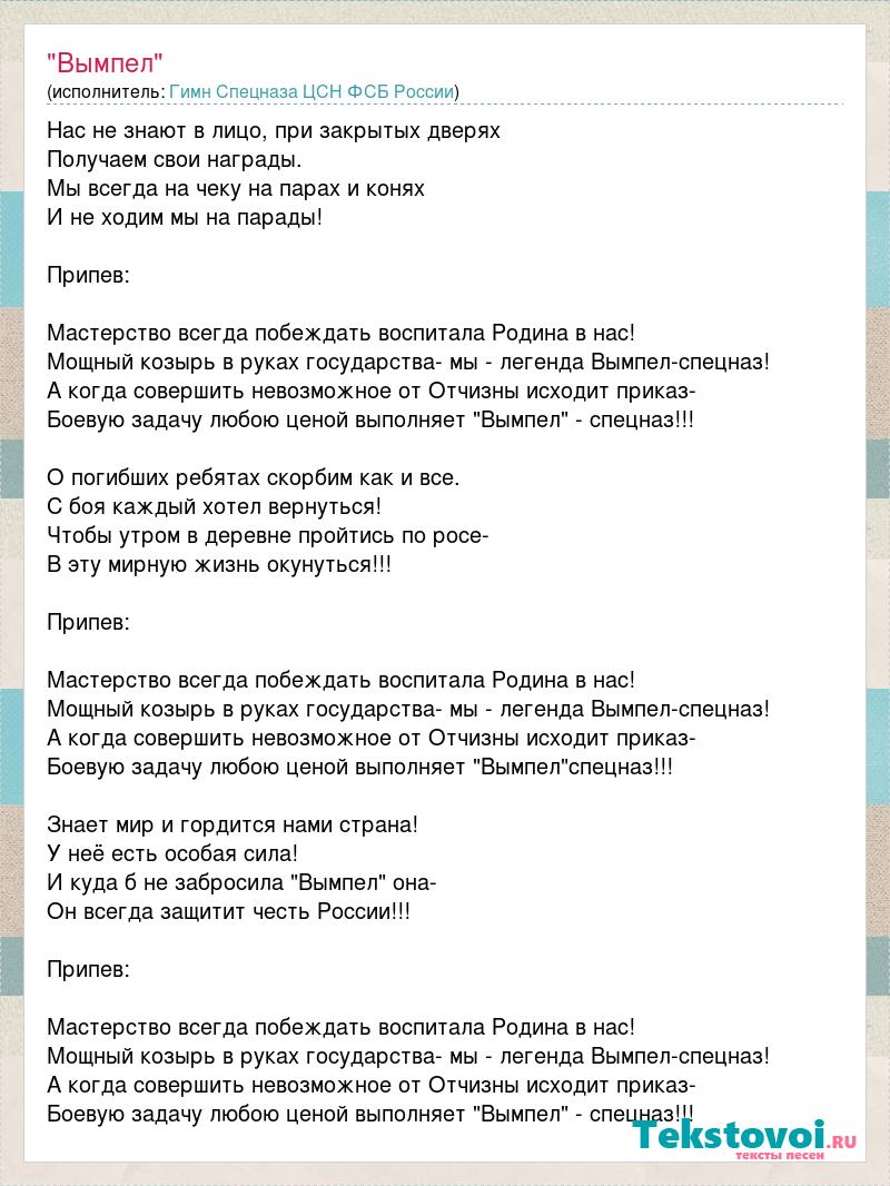 Нас не знают в лицо, при закрытых дверях Получаем свои награды. Мы всегда на чеку на парах и конях И не ходим мы на парады! Припев: Мастерство всегда побеждать воспитала Родина в нас! Мощный козырь в руках государства- мы - легенда Вымпел-спецназ! А когда совершить невозможное от Отчизны исходит приказ- Боевую задачу любою ценой выполняет "Вымпел" - спецназ!!! О погибших ребятах скорбим как и все. С боя каждый хотел вернуться! Чтобы утром в деревне пройтись по росе- В эту мирную жизнь окунуться!!! Припев: Мастерство всегда побеждать воспитала Родина в нас! Мощный козырь в руках государства- мы - легенда Вымпел-спецназ! А когда совершить невозможное от Отчизны исходит приказ- Боевую задачу любою ценой выполняет "Вымпел"спецназ!!! Знает мир и гордится нами страна! У неё есть особая сила! И куда б не забросила "Вымпел" она- Он всегда защитит честь России!!! Припев: Мастерство всегда побеждать воспитала Родина в нас! Мощный козырь в руках государства- мы - легенда Вымпел-спецназ! А когда совершить невозможное от Отчизны исходит приказ- Боевую задачу любою ценой выполняет "Вымпел" - спецназ!!!