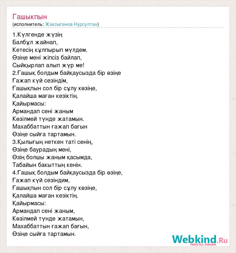 1.Күлгенде жүзің Балбұл жайнап, Кетесің кұлпырып мүлдем. Өзіңе мені жіпсіз байлап, Сыйқырлап алып жүр ме! 2.Ғашық болдым байқаусызда бір өзіңе Ғажап күй сезіндім, Ғашықпын сол бір сұлу көзіңе, Қалайша маған кезіктің. Қайырмасы: Армандап сені жаным Көзілмей түнде жатамын. Махаббаттын ғажап бағын Өзіңе сыйға тартамын. 3.Қылығың неткен таті сенің, Өзіңе баурадың мені, Өзің болшы жаным қасымда, Табайын бакыттың кенін. 4.Ғашық болдым байқаусызда бір өзіңе, Ғажап күй сезіндим, Ғашықпын сол бір сұлу көзіңе, Қалайша маған кезіктің. Қайырмасы: Армандап сені жаным, Көзілмей түнде жатамын, Махаббаттын ғажап бағын, Өзіңе сыйға тартамын.