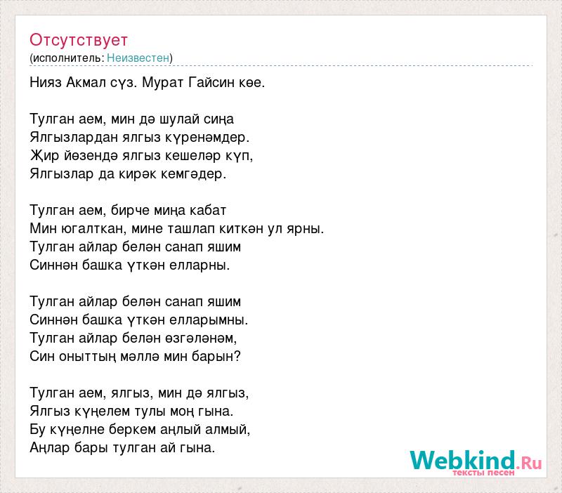 Нияз Акмал сүз. Мурат Гайсин көе. Тулган аем, мин дә шулай сиңа Ялгызлардан ялгыз күренәмдер. Җир йөзендә ялгыз кешеләр күп, Ялгызлар да кирәк кемгәдер. Тулган аем, бирче миңа кабат Мин югалткан, мине ташлап киткән ул ярны. Тулган айлар белән санап яшим Синнән башка үткән елларны. Тулган айлар белән санап яшим Синнән башка үткән елларымны. Тулган айлар белән өзгәләнәм, Син оныттың мәллә мин барын? Тулган аем, ялгыз, мин дә ялгыз, Ялгыз күңелем тулы моң гына. Бу күңелне беркем аңлый алмый, Аңлар бары тулган ай гына.