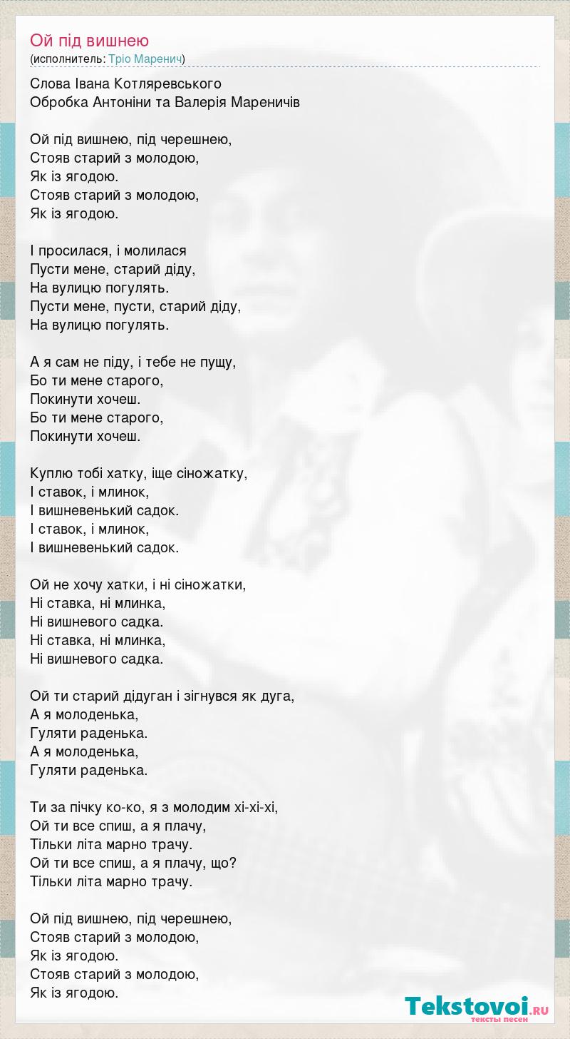 Слова Івана Котляревського Обробка Антоніни та Валерія Мареничів Ой під вишнею, під черешнею, Стояв старий з молодою, Як із ягодою. Стояв старий з молодою, Як із ягодою. І просилася, і молилася Пусти мене, старий діду, На вулицю погулять. Пусти мене, пусти, старий діду, На вулицю погулять. А я сам не піду, і тебе не пущу, Бо ти мене старого, Покинути хочеш. Бо ти мене старого, Покинути хочеш. Куплю тобі хатку, іще сіножатку, І ставок, і млинок, І вишневенький садок. І ставок, і млинок, І вишневенький садок. Ой не хочу хатки, і ні сіножатки, Ні ставка, ні млинка, Ні вишневого садка. Ні ставка, ні млинка, Ні вишневого садка. Ой ти старий дідуган і зігнувся як дуга, А я молоденька, Гуляти раденька. А я молоденька, Гуляти раденька. Ти за пічку ко-ко, я з молодим хі-хі-хі, Ой ти все спиш, а я плачу, Тільки літа марно трачу. Ой ти все спиш, а я плачу, що? Тільки літа марно трачу. Ой під вишнею, під черешнею, Стояв старий з молодою, Як із ягодою. Стояв старий з молодою, Як із ягодою.