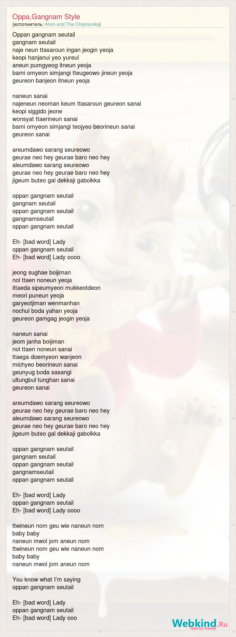 Oppan gangnam seutail gangnam seutail naje neun ttasaroun ingan jeogin yeoja keopi hanjanui yeo yureul aneun pumgyeog itneun yeoja bami omyeon simjangi tteugeowo jineun yeoja geureon banjeon itneun yeoja naneun sanai najeneun neoman keum ttasaroun geureon sanai keopi siggido jeone wonsyat ttaerineun sanai bami omyeon simjangi teojyeo beorineun sanai geureon sanai areumdawo sarang seureowo geurae neo hey geurae baro neo hey aleumdawo sarang seureowo geurae neo hey geurae baro neo hey jigeum buteo gal dekkaji gabolkka oppan gangnam seutail gangnam seutail oppan gangnam seutail gangnamseutail oppan gangnam seutail Eh- [bad word] Lady oppan gangnam seutail Eh- [bad word] Lady oooo jeong sughae boijiman nol ttaen noneun yeoja ittaeda sipeumyeon mukkeotdeon meori puneun yeoja garyeotjiman wenmanhan nochul boda yahan yeoja geureon gamgag jeogin yeoja naneun sanai jeom janha boijiman nol ttaen noneun sanai ttaega doemyeon wanjeon michyeo beorineun sanai geunyug boda sasangi ultungbul tunghan sanai geureon sanai areumdawo sarang seureowo geurae neo hey geurae baro neo hey aleumdawo sarang seureowo geurae neo hey geurae baro neo hey jigeum buteo gal dekkaji gabolkka oppan gangnam seutail gangnam seutail oppan gangnam seutail gangnamseutail oppan gangnam seutail Eh- [bad word] Lady oppan gangnam seutail Eh- [bad word] Lady oooo ttwineun nom geu wie naneun nom baby baby naneun mwol jom aneun nom ttwineun nom geu wie naneun nom baby baby naneun mwol jom aneun nom You know what I’m saying oppan gangnam seutail Eh- [bad word] Lady oppan gangnam seutail Eh- [bad word] Lady ooo
