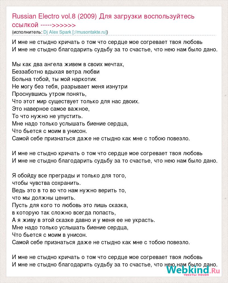 И мне не стыдно кричать о том что сердце мое согревает твоя любовь И мне не стыдно благодарить судьбу за то счастье, что нею нам было дано. Мы как два ангела живем в своих мечтах, Беззаботно вдыхая ветра любви Больна тобой, ты мой наркотик Не могу без тебя, разрывает меня изнутри Проснувшись утром понять, Что этот мир существует только для нас двоих. Это наверное самое важное, То что нужно не упустить. Мне надо только услышать биение сердца, Что бьется с моим в унисон. Самой себе признаться даже не стыдно как мне с тобою повезло. И мне не стыдно кричать о том что сердце мое согревает твоя любовь И мне не стыдно благодарить судьбу за то счастье, что нею нам было дано. Я обойду все преграды и только для того, чтобы чувства сохранить. Ведь это в то во что нам нужно верить то, что мы должны ценить. Пусть для кого то любовь это лишь сказка, в которую так сложно всегда попасть, А я живу в этой сказке давно и у меня ее не украсть. Мне надо только услышать биение сердца, Что бьется с моим в унисон. Самой себе признаться даже не стыдно как мне с тобою повезло. И мне не стыдно кричать о том что сердце мое согревает твоя любовь И мне не стыдно благодарить судьбу за то счастье, что нею нам было дано.