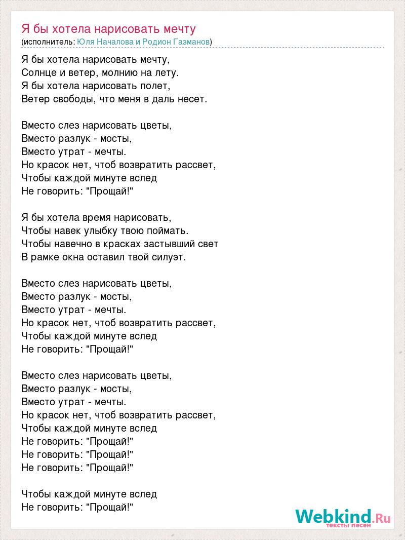 Я бы хотела нарисовать мечту, Солнце и ветер, молнию на лету. Я бы хотела нарисовать полет, Ветер свободы, что меня в даль несет. Вместо слез нарисовать цветы, Вместо разлук - мосты, Вместо утрат - мечты. Но красок нет, чтоб возвратить рассвет, Чтобы каждой минуте вслед Не говорить: "Прощай!" Я бы хотела время нарисовать, Чтобы навек улыбку твою поймать. Чтобы навечно в красках застывший свет В рамке окна оставил твой силуэт. Вместо слез нарисовать цветы, Вместо разлук - мосты, Вместо утрат - мечты. Но красок нет, чтоб возвратить рассвет, Чтобы каждой минуте вслед Не говорить: "Прощай!" Вместо слез нарисовать цветы, Вместо разлук - мосты, Вместо утрат - мечты. Но красок нет, чтоб возвратить рассвет, Чтобы каждой минуте вслед Не говорить: "Прощай!" Не говорить: "Прощай!" Не говорить: "Прощай!" Чтобы каждой минуте вслед Не говорить: "Прощай!"