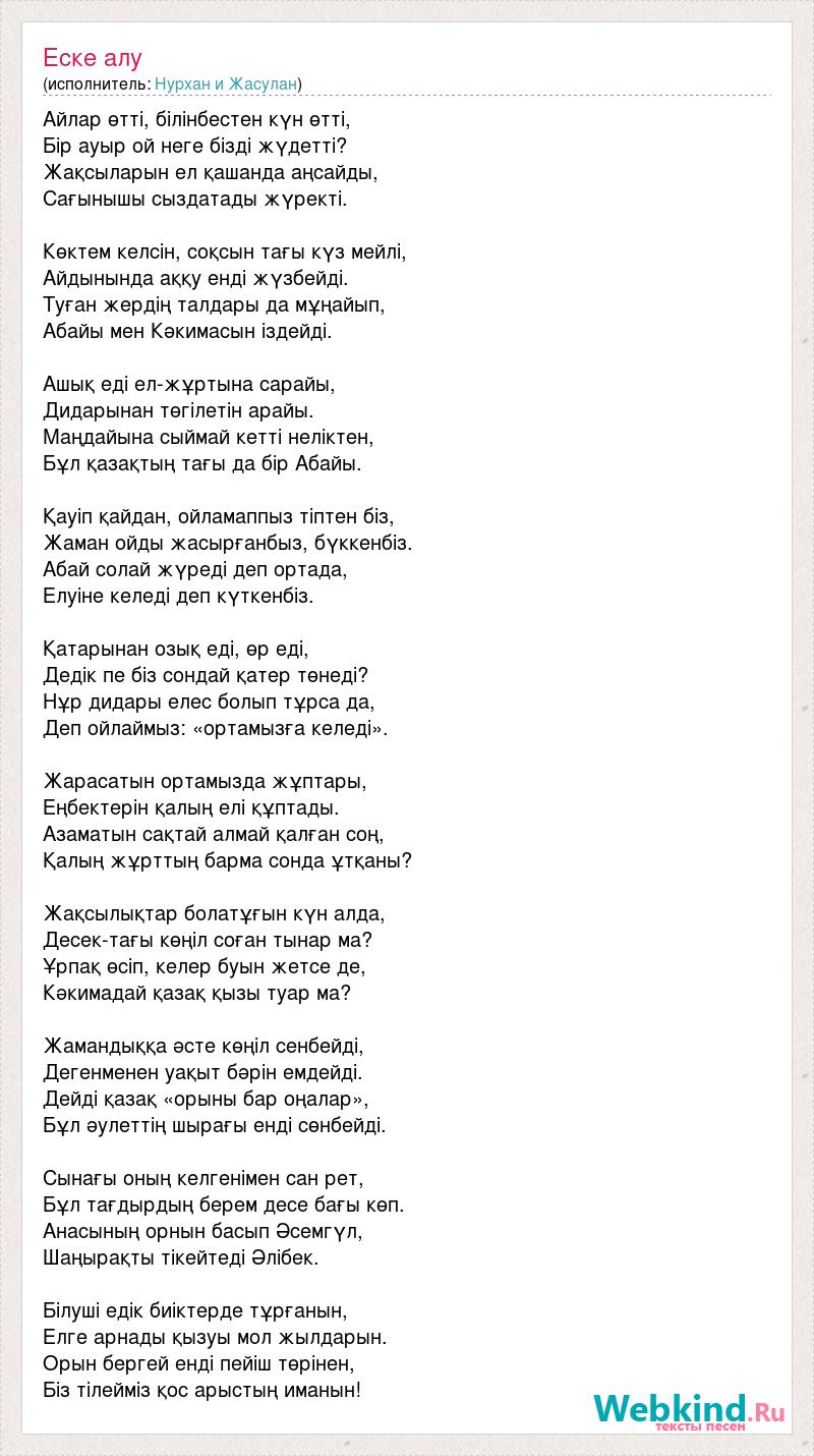 Айлар өтті, білінбестен күн өтті, Бір ауыр ой неге бізді жүдетті? Жақсыларын ел қашанда аңсайды, Сағынышы сыздатады жүректі. Көктем келсін, соқсын тағы күз мейлі, Айдынында аққу енді жүзбейді. Туған жердің талдары да мұңайып, Абайы мен Кәкимасын іздейді. Ашық еді ел-жұртына сарайы, Дидарынан төгілетін арайы. Маңдайына сыймай кетті неліктен, Бұл қазақтың тағы да бір Абайы. Қауіп қайдан, ойламаппыз тіптен біз, Жаман ойды жасырғанбыз, бүккенбіз. Абай солай жүреді деп ортада, Елуіне келеді деп күткенбіз. Қатарынан озық еді, өр еді, Дедік пе біз сондай қатер төнеді? Нұр дидары елес болып тұрса да, Деп ойлаймыз: «ортамызға келеді». Жарасатын ортамызда жұптары, Еңбектерін қалың елі құптады. Азаматын сақтай алмай қалған соң, Қалың жұрттың барма сонда ұтқаны? Жақсылықтар болатұғын күн алда, Десек-тағы көңіл соған тынар ма? Ұрпақ өсіп, келер буын жетсе де, Кәкимадай қазақ қызы туар ма? Жамандыққа әсте көңіл сенбейді, Дегенменен уақыт бәрін емдейді. Дейді қазақ «орыны бар оңалар», Бұл әулеттің шырағы енді сөнбейді. Сынағы оның келгенімен сан рет, Бұл тағдырдың берем десе бағы көп. Анасының орнын басып Әсемгүл, Шаңырақты тікейтеді Әлібек. Білуші едік биіктерде тұрғанын, Елге арнады қызуы мол жылдарын. Орын бергей енді пейіш төрінен, Біз тілейміз қос арыстың иманын!