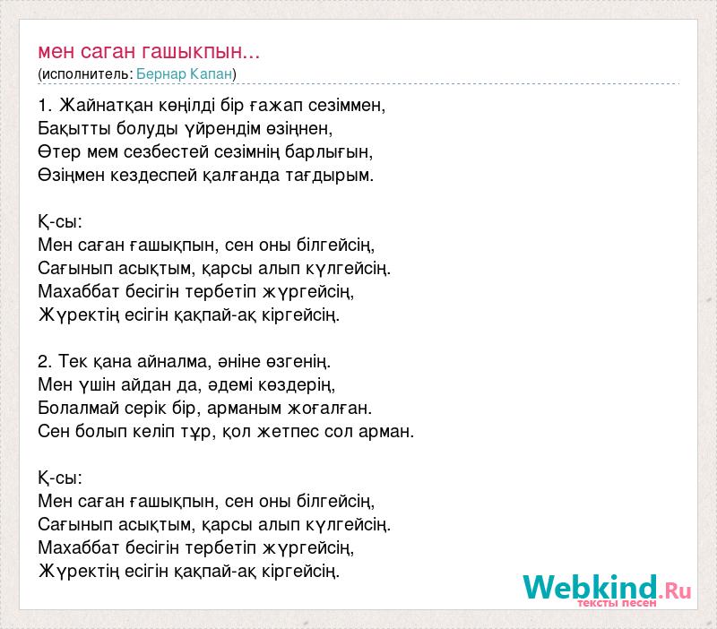 1. Жайнатқан көңілді бір ғажап сезіммен, Бақытты болуды үйрендім өзіңнен, Өтер мем сезбестей сезімнің барлығын, Өзіңмен кездеспей қалғанда тағдырым. Қ-сы: Мен саған ғашықпын, сен оны білгейсің, Сағынып асықтым, қарсы алып күлгейсің. Махаббат бесігін тербетіп жүргейсің, Жүректің есігін қақпай-ақ кіргейсің. 2. Тек қана айналма, әніне өзгенің. Мен үшін айдан да, әдемі көздерің, Болалмай серік бір, арманым жоғалған. Сен болып келіп тұр, қол жетпес сол арман. Қ-сы: Мен саған ғашықпын, сен оны білгейсің, Сағынып асықтым, қарсы алып күлгейсің. Махаббат бесігін тербетіп жүргейсің, Жүректің есігін қақпай-ақ кіргейсің.