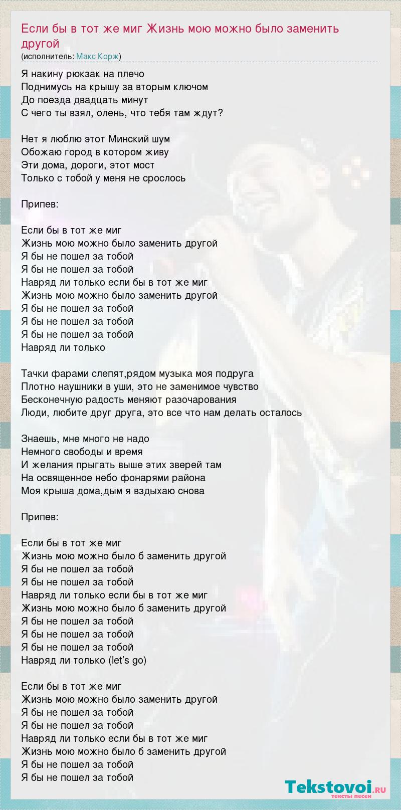 Я накину рюкзак на плечо Поднимусь на крышу за вторым ключом До поезда двадцать минут С чего ты взял, олень, что тебя там ждут? Нет я люблю этот Минский шум Обожаю город в котором живу Эти дома, дороги, этот мост Только с тобой у меня не срослось Припев: Если бы в тот же миг Жизнь мою можно было заменить другой Я бы не пошел за тобой Я бы не пошел за тобой Навряд ли только если бы в тот же миг Жизнь мою можно было заменить другой Я бы не пошел за тобой Я бы не пошел за тобой Я бы не пошел за тобой Навряд ли только Тачки фарами слепят,рядом музыка моя подруга Плотно наушники в уши, это не заменимое чувство Бесконечную радость меняют разочарования Люди, любите друг друга, это все что нам делать осталось Знаешь, мне много не надо Немного свободы и время И желания прыгать выше этих зверей там На освященное небо фонарями района Моя крыша дома,дым я вздыхаю снова Припев: Если бы в тот же миг Жизнь мою можно было б заменить другой Я бы не пошел за тобой Я бы не пошел за тобой Навряд ли только если бы в тот же миг Жизнь мою можно было б заменить другой Я бы не пошел за тобой Я бы не пошел за тобой Я бы не пошел за тобой Навряд ли только (let’s go) Если бы в тот же миг Жизнь мою можно было заменить другой Я бы не пошел за тобой Я бы не пошел за тобой Навряд ли только если бы в тот же миг Жизнь мою можно было б заменить другой Я бы не пошел за тобой Я бы не пошел за тобой