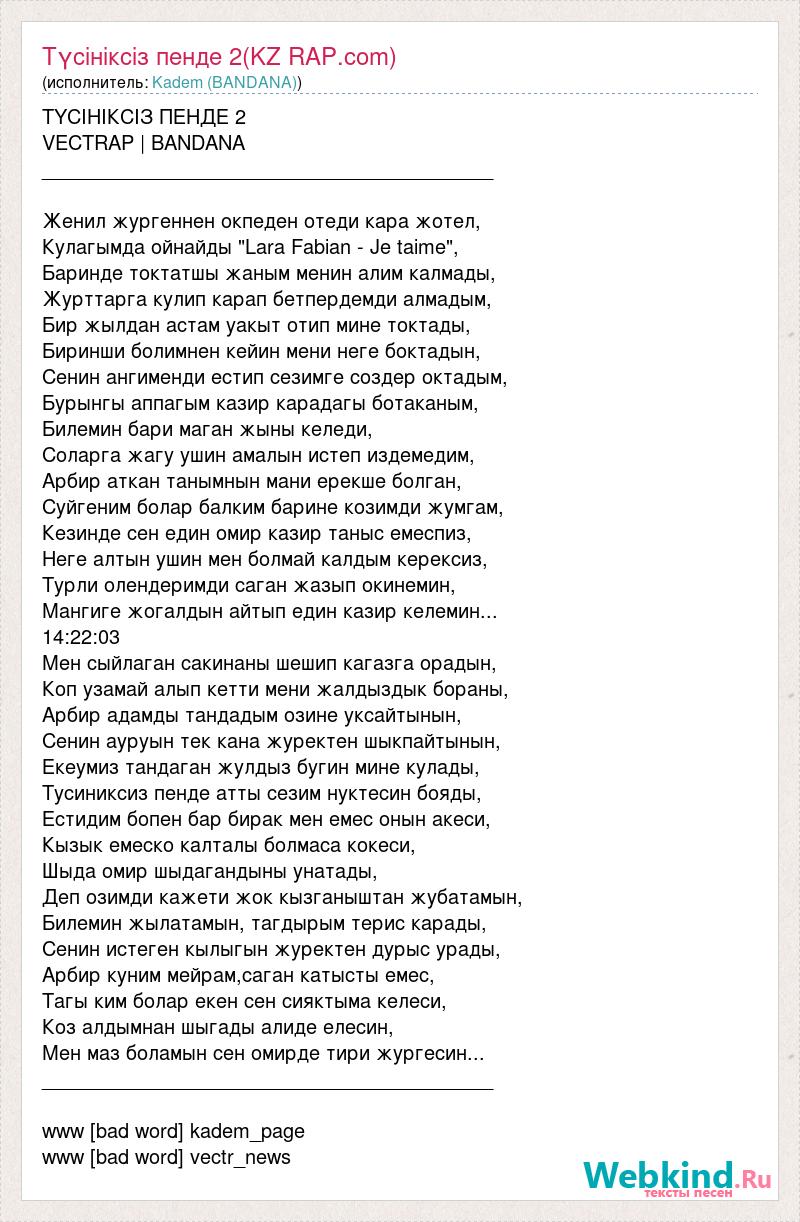 ТҮСІНІКСІЗ ПЕНДЕ 2 VECTRAP | BANDANA _________________________________________ Женил жургеннен окпеден отеди кара жотел, Кулагымда ойнайды "Lara Fabian - Je taime", Баринде токтатшы жаным менин алим калмады, Журттарга кулип карап бетпердемди алмадым, Бир жылдан астам уакыт отип мине токтады, Биринши болимнен кейин мени неге боктадын, Сенин ангименди естип сезимге создер октадым, Бурынгы аппагым казир карадагы ботаканым, Билемин бари маган жыны келеди, Соларга жагу ушин амалын истеп издемедим, Арбир аткан танымнын мани ерекше болган, Суйгеним болар балким барине козимди жумгам, Кезинде сен един омир казир таныс емеспиз, Неге алтын ушин мен болмай калдым керексиз, Турли олендеримди саган жазып окинемин, Мангиге жогалдын айтып един казир келемин... 14:22:03 Мен сыйлаган сакинаны шешип кагазга орадын, Коп узамай алып кетти мени жалдыздык бораны, Арбир адамды тандадым озине уксайтынын, Сенин ауруын тек кана журектен шыкпайтынын, Екеумиз тандаган жулдыз бугин мине кулады, Тусиниксиз пенде атты сезим нуктесин бояды, Естидим бопен бар бирак мен емес онын акеси, Кызык емеско калталы болмаса кокеси, Шыда омир шыдагандыны унатады, Деп озимди кажети жок кызганыштан жубатамын, Билемин жылатамын, тагдырым терис карады, Сенин истеген кылыгын журектен дурыс урады, Арбир куним мейрам,саган катысты емес, Тагы ким болар екен сен сияктыма келеси, Коз алдымнан шыгады алиде елесин, Мен маз боламын сен омирде тири жургесин... _________________________________________ www [bad word] kadem_page www [bad word] vectr_news