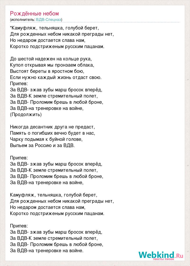 "Камуфляж, тельняшка, голубой берет, Для рожденных небом никакой преграды нет, Но недаром достается слава нам, Коротко подстриженым русским пацанам. До шестой надежен на кольце рука, Купол открывая мы пронзаем облака, Выстоят береты в яростном бою, Если нужно каждый жизнь отдаст свою. Припев: За ВДВ- зжав зубы марш бросок вперёд, За ВДВ-К земле стремительный полет, За ВДВ- Проломим брешь в любой броне, За ВДВ-на тренеровке на войне, (Продолжить) Никогда десантник друга не предаст, Память о погибших вечно будет в нас, Чарку подымая к буйной голове, Выпьем за Россию и за ВДВ. Припев: За ВДВ- зжав зубы марш бросок вперёд, За ВДВ-К земле стремительный полет, За ВДВ- Проломим брешь в любой броне, За ВДВ-на тренеровке на войне, Камуфляж, тельняшка, голубой берет, Для рожденных небом никакой преграды нет, Но недаром достается слава нам, Коротко подстриженым русским пацанам. Припев: За ВДВ- зжав зубы марш бросок вперёд, За ВДВ-К земле стремительный полет, За ВДВ- Проломим брешь в любой броне, За ВДВ-на тренеровке на войне.