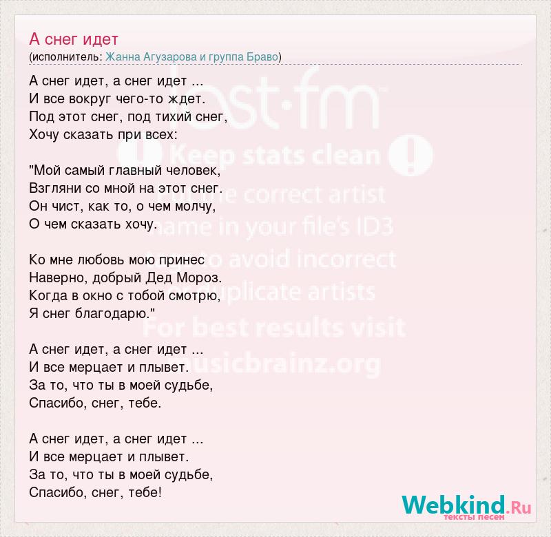 А снег идет, а снег идет ... И все вокруг чего-то ждет. Под этот снег, под тихий снег, Хочу сказать при всех: "Мой самый главный человек, Взгляни со мной на этот снег. Он чист, как то, о чем молчу, О чем сказать хочу. Ко мне любовь мою принес Наверно, добрый Дед Мороз. Когда в окно с тобой смотрю, Я снег благодарю." А снег идет, а снег идет ... И все мерцает и плывет. За то, что ты в моей судьбе, Спасибо, снег, тебе. А снег идет, а снег идет ... И все мерцает и плывет. За то, что ты в моей судьбе, Спасибо, снег, тебе!
