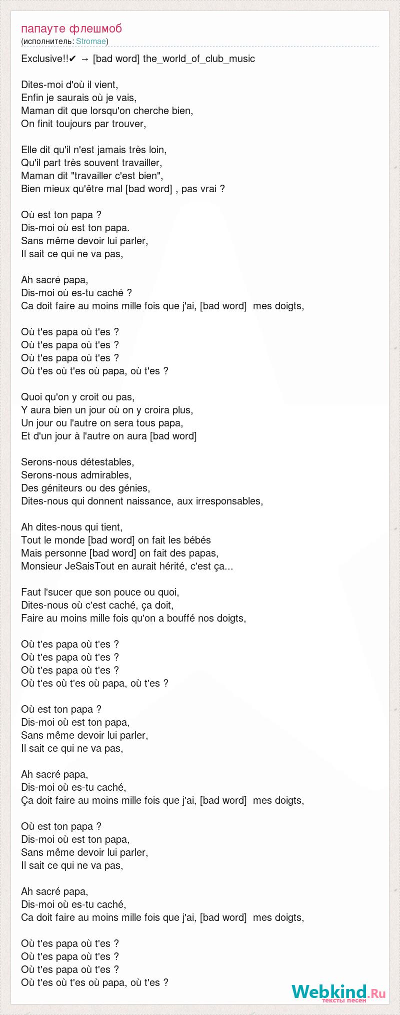 Exclusive!!✔ → [bad word] the_world_of_club_music Dites-moi d'où il vient, Enfin je saurais où je vais, Maman dit que lorsqu'on cherche bien, On finit toujours par trouver, Elle dit qu'il n'est jamais très loin, Qu'il part très souvent travailler, Maman dit "travailler c'est bien", Bien mieux qu'être mal [bad word] , pas vrai ? Où est ton papa ? Dis-moi où est ton papa. Sans même devoir lui parler, Il sait ce qui ne va pas, Ah sacré papa, Dis-moi où es-tu caché ? Ca doit faire au moins mille fois que j'ai, [bad word] mes doigts, Où t'es papa où t'es ? Où t'es papa où t'es ? Où t'es papa où t'es ? Où t'es où t'es où papa, où t'es ? Quoi qu'on y croit ou pas, Y aura bien un jour où on y croira plus, Un jour ou l'autre on sera tous papa, Et d'un jour à l'autre on aura [bad word] Serons-nous détestables, Serons-nous admirables, Des géniteurs ou des génies, Dites-nous qui donnent naissance, aux irresponsables, Ah dites-nous qui tient, Tout le monde [bad word] on fait les bébés Mais personne [bad word] on fait des papas, Monsieur JeSaisTout en aurait hérité, c'est ça... Faut l'sucer que son pouce ou quoi, Dites-nous où c'est caché, ça doit, Faire au moins mille fois qu'on a bouffé nos doigts, Où t'es papa où t'es ? Où t'es papa où t'es ? Où t'es papa où t'es ? Où t'es où t'es où papa, où t'es ? Où est ton papa ? Dis-moi où est ton papa, Sans même devoir lui parler, Il sait ce qui ne va pas, Ah sacré papa, Dis-moi où es-tu caché, Ça doit faire au moins mille fois que j'ai, [bad word] mes doigts, Où est ton papa ? Dis-moi où est ton papa, Sans même devoir lui parler, Il sait ce qui ne va pas, Ah sacré papa, Dis-moi où es-tu caché, Ca doit faire au moins mille fois que j'ai, [bad word] mes doigts, Où t'es papa où t'es ? Où t'es papa où t'es ? Où t'es papa où t'es ? Où t'es où t'es où papa, où t'es ?