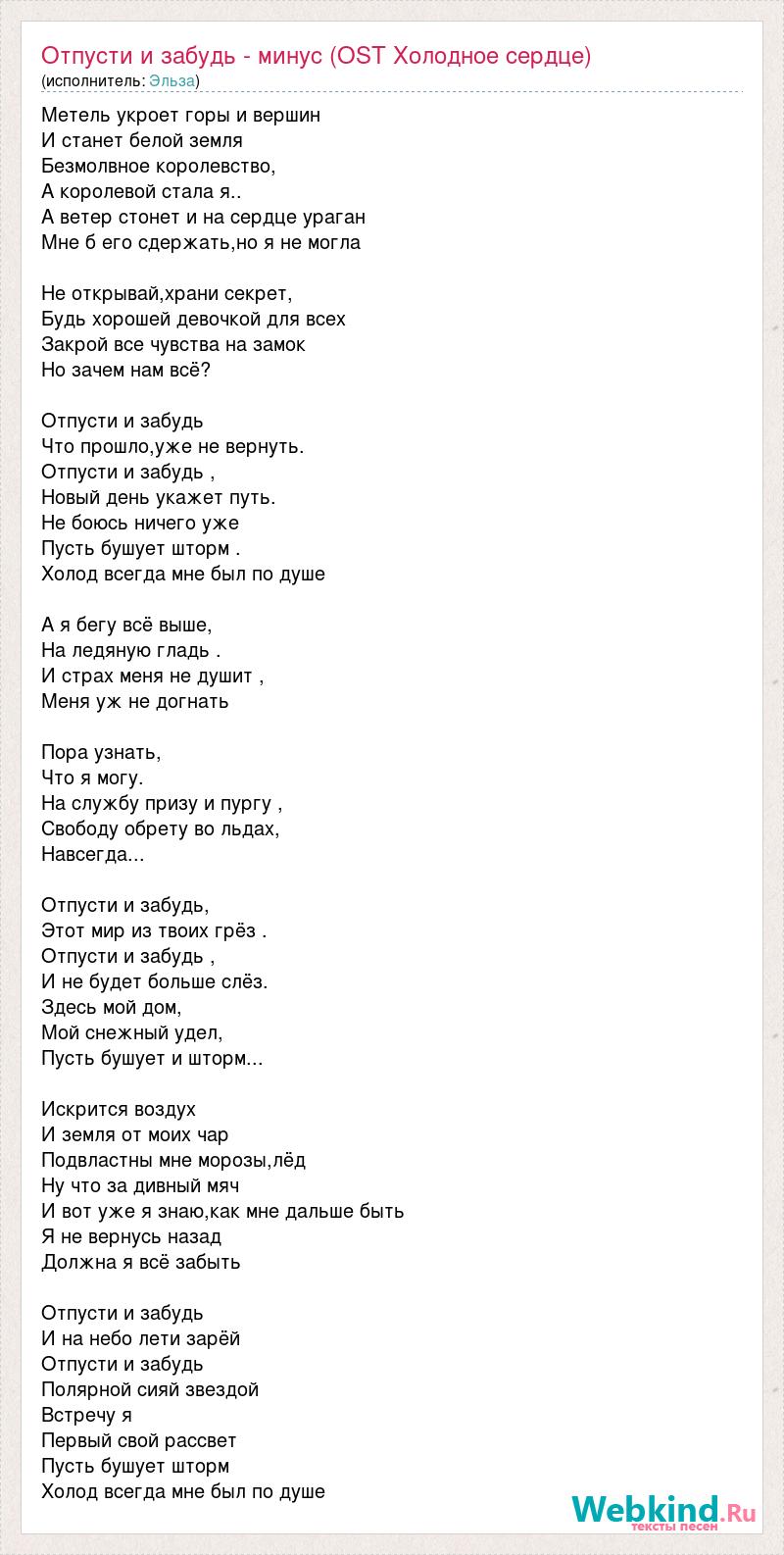 Метель укроет горы и вершин И станет белой земля Безмолвное королевство, А королевой стала я.. А ветер стонет и на сердце ураган Мне б его сдержать,но я не могла Не открывай,храни секрет, Будь хорошей девочкой для всех Закрой все чувства на замок Но зачем нам всё? Отпусти и забудь Что прошло,уже не вернуть. Отпусти и забудь , Новый день укажет путь. Не боюсь ничего уже Пусть бушует шторм . Холод всегда мне был по душе А я бегу всё выше, На ледяную гладь . И страх меня не душит , Меня уж не догнать Пора узнать, Что я могу. На службу призу и пургу , Свободу обрету во льдах, Навсегда... Отпусти и забудь, Этот мир из твоих грёз . Отпусти и забудь , И не будет больше слёз. Здесь мой дом, Мой снежный удел, Пусть бушует и шторм... Искрится воздух И земля от моих чар Подвластны мне морозы,лёд Ну что за дивный мяч И вот уже я знаю,как мне дальше быть Я не вернусь назад Должна я всё забыть Отпусти и забудь И на небо лети зарёй Отпусти и забудь Полярной сияй звездой Встречу я Первый свой рассвет Пусть бушует шторм Холод всегда мне был по душе