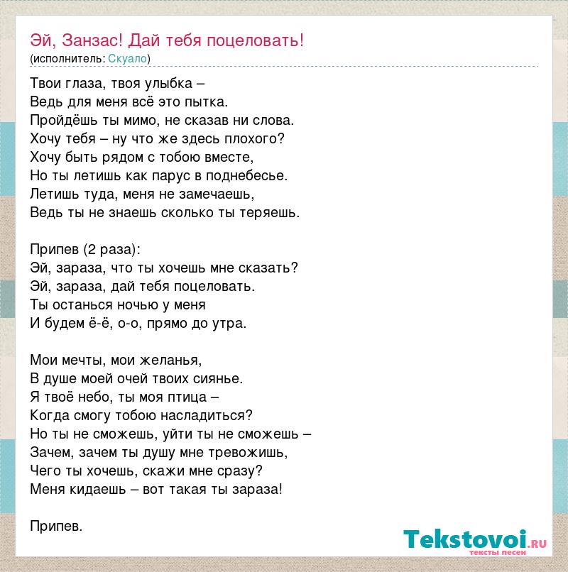 Твои глаза, твоя улыбка – Ведь для меня всё это пытка. Пройдёшь ты мимо, не сказав ни слова. Хочу тебя – ну что же здесь плохого? Хочу быть рядом с тобою вместе, Но ты летишь как парус в поднебесье. Летишь туда, меня не замечаешь, Ведь ты не знаешь сколько ты теряешь. Припев (2 раза): Эй, зараза, что ты хочешь мне сказать? Эй, зараза, дай тебя поцеловать. Ты останься ночью у меня И будем ё-ё, о-о, прямо до утра. Мои мечты, мои желанья, В душе моей очей твоих сиянье. Я твоё небо, ты моя птица – Когда смогу тобою насладиться? Но ты не сможешь, уйти ты не сможешь – Зачем, зачем ты душу мне тревожишь, Чего ты хочешь, скажи мне сразу? Меня кидаешь – вот такая ты зараза! Припев.